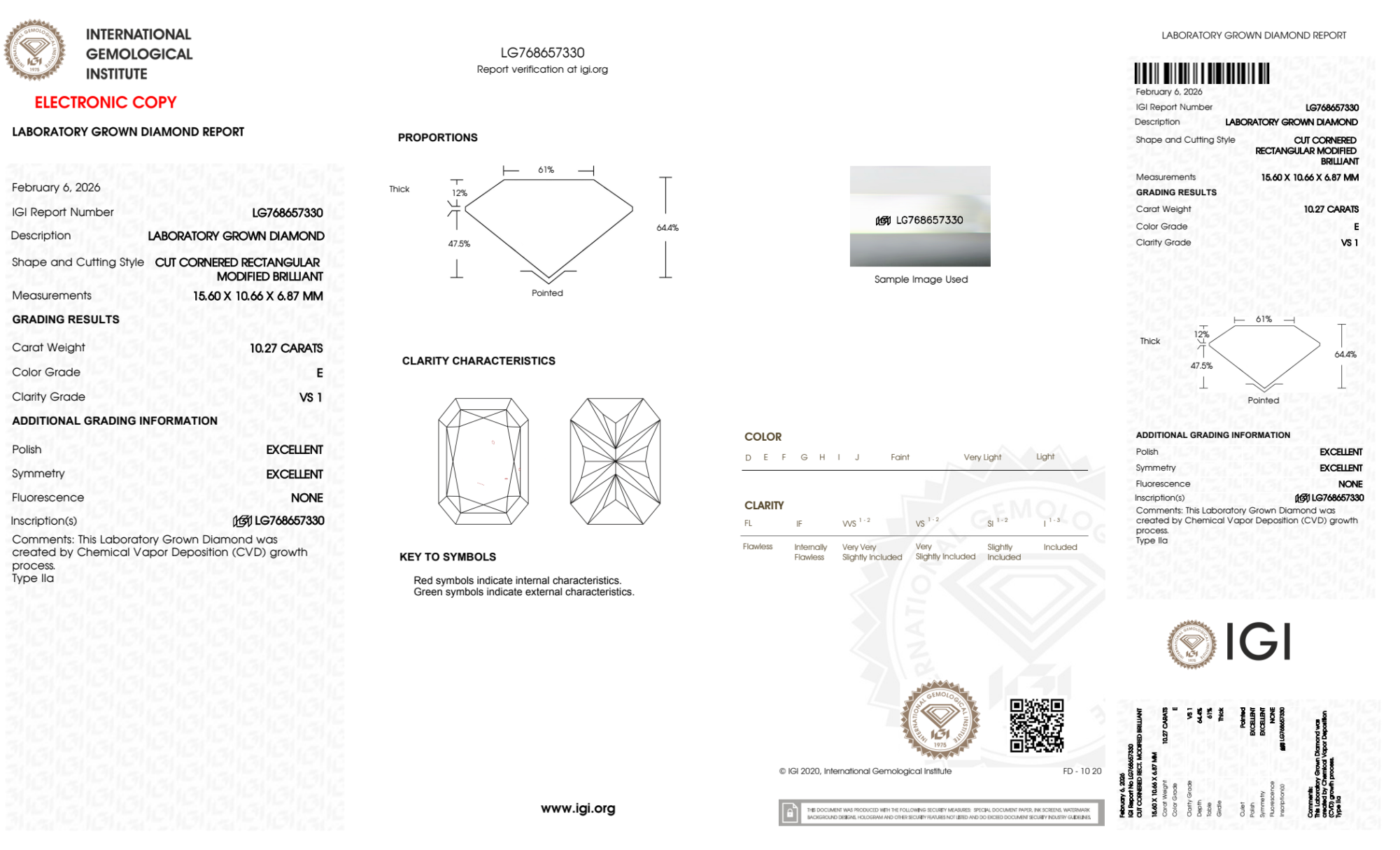 Your 10.27 carat Radiant lab diamond is graded E color (Colorless), and you can read more about E color diamonds here.