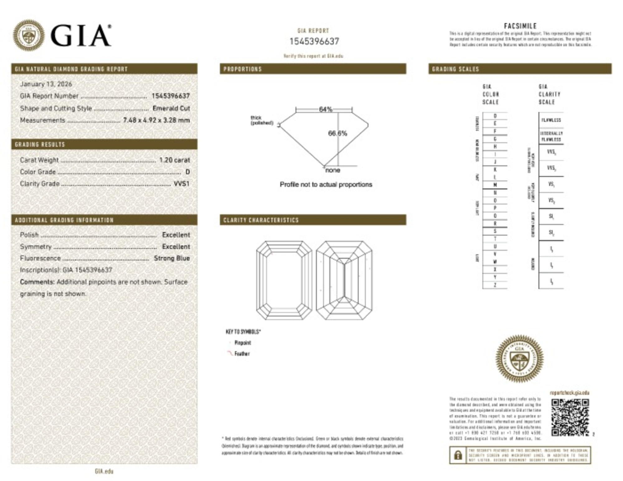 Your 1.20 carat Emerald natural diamond is graded VVS1 clarity, which stands for Very Very Slightly Included 1. Read more about VVS1 clarity diamonds here, or learn more about diamond clarity in general here.