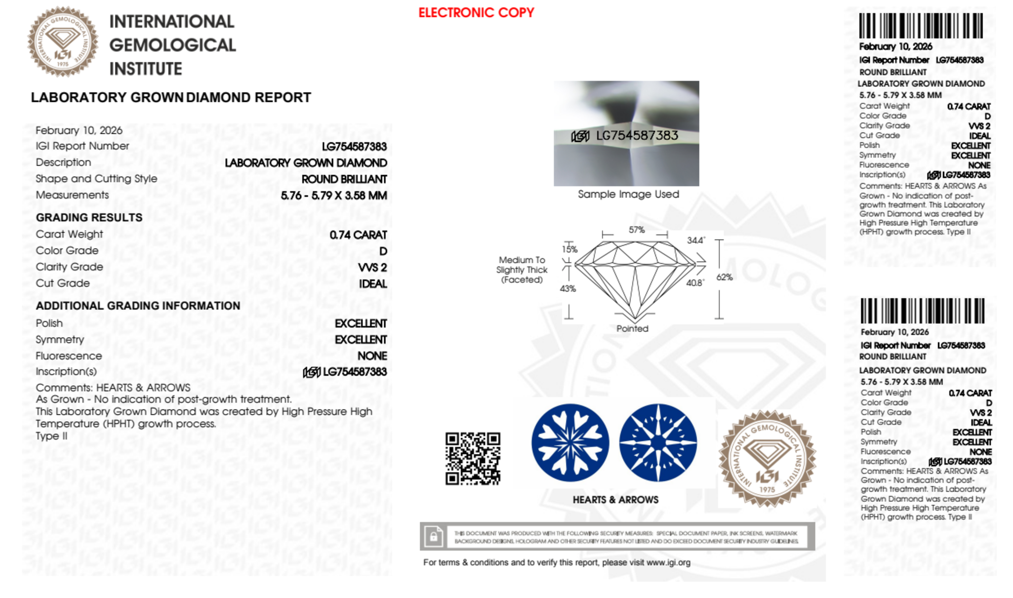 Your 0.74 carat Round lab diamond is graded VVS2 clarity, which stands for Very Very Slightly Included 2. Read more about VVS2 clarity diamonds here, or learn more about diamond clarity in general here.