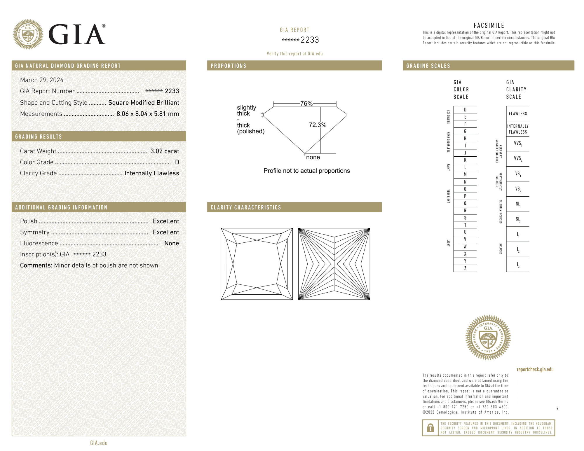 Your 3.02 carat Princess natural diamond is graded D color (Colorless), and you can read more about D color diamonds here.