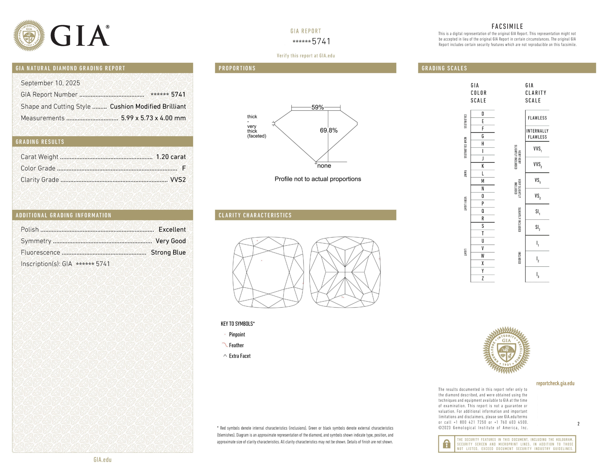 Your 1.20 carat Cushion natural diamond is graded F color (Colorless), and you can read more about F color diamonds here.