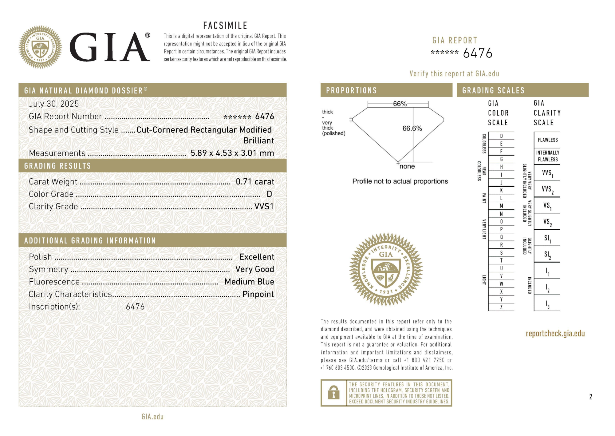 Your 0.71 carat Radiant natural diamond is graded D color (Colorless), and you can read more about D color diamonds here.