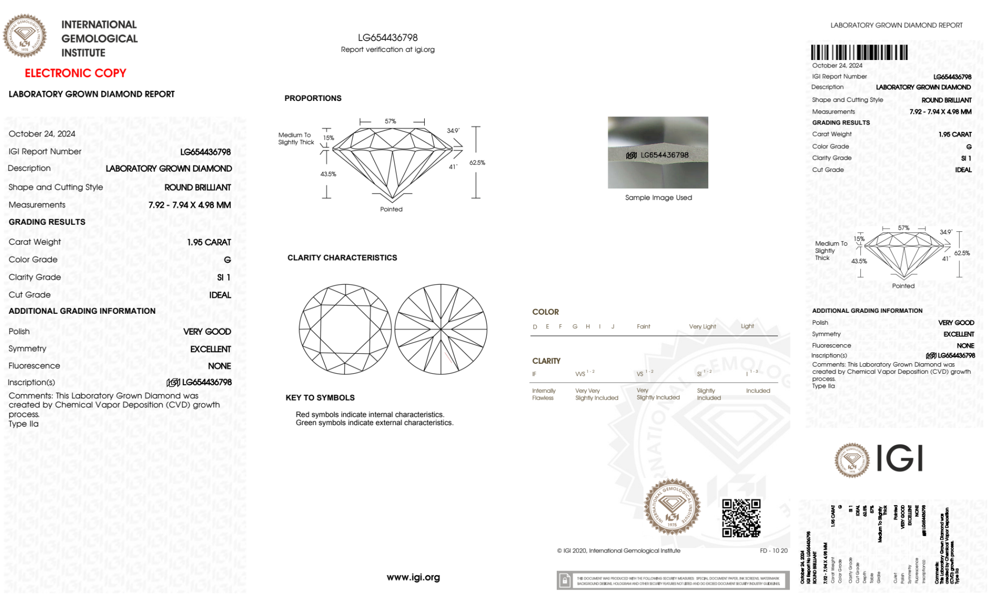 Your 1.95 carat Round lab diamond is graded SI1 clarity, which stands for Slightly Included 1. Read more about SI1 clarity diamonds here, or learn more about diamond clarity in general here.