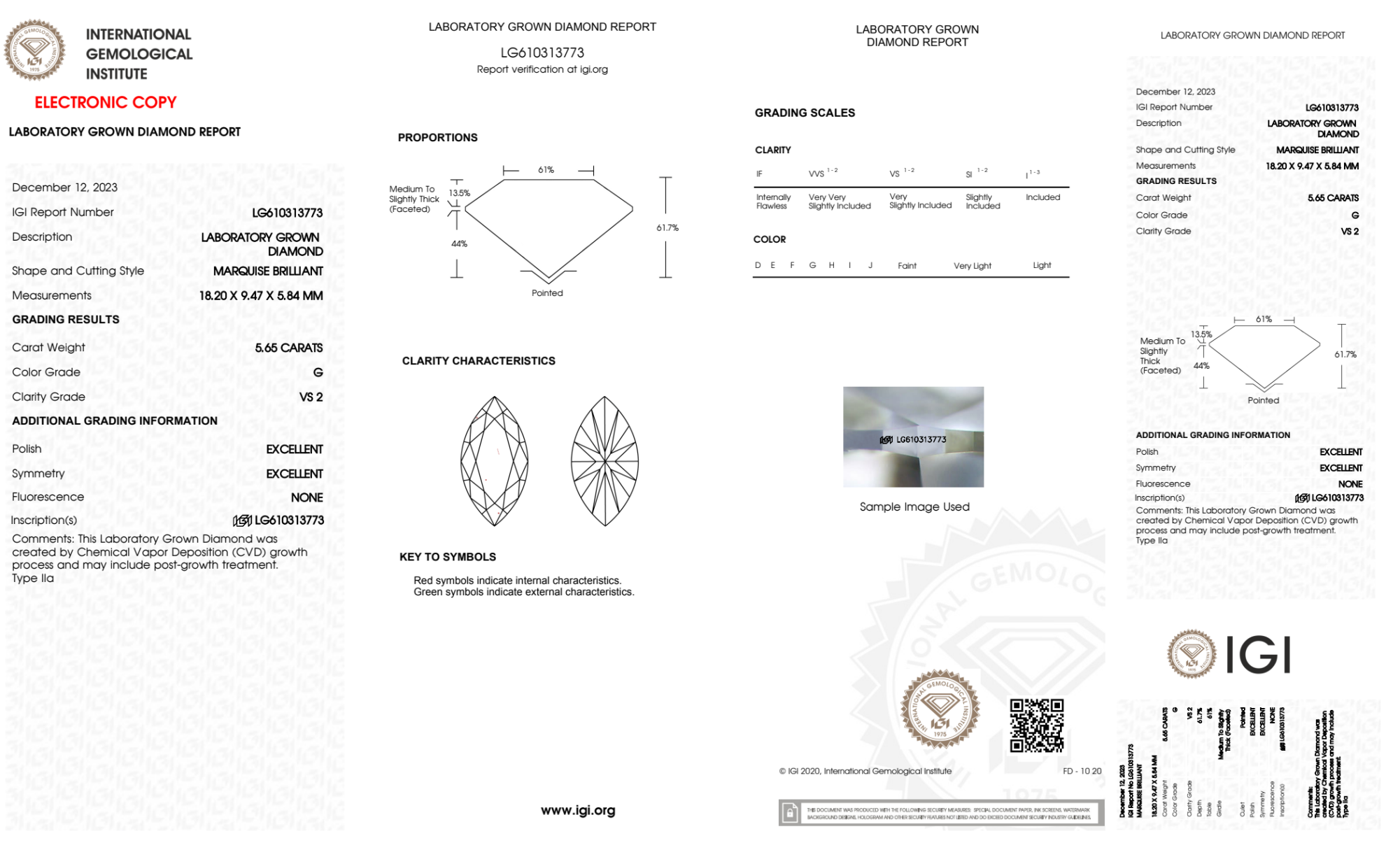Your 5.65 carat Marquise lab diamond is graded G color (Near Colorless), and you can read more about G color diamonds here.