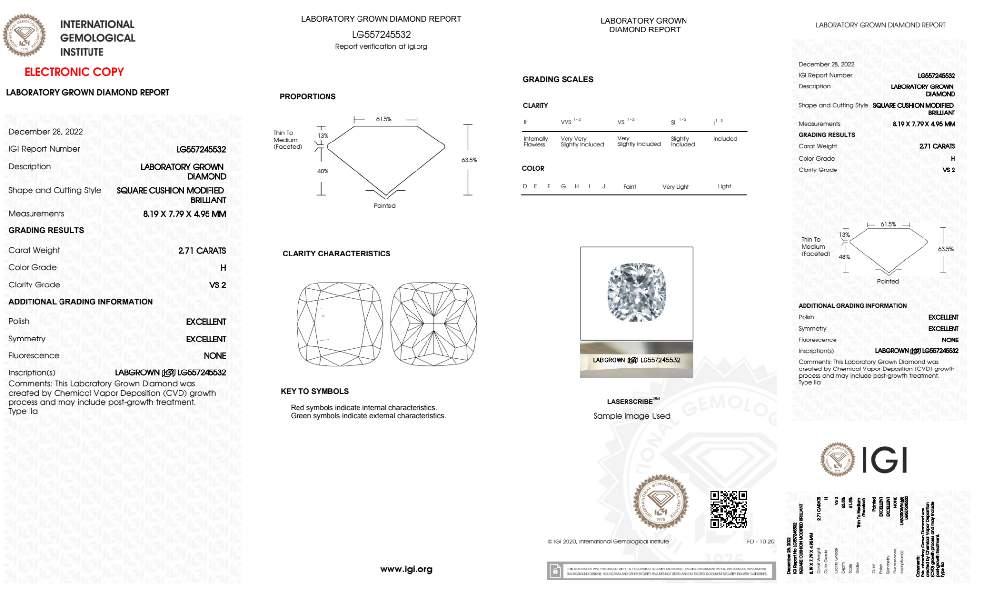Your 2.71 carat Cushion lab diamond is graded H color (Near Colorless), and you can read more about H color diamonds here.