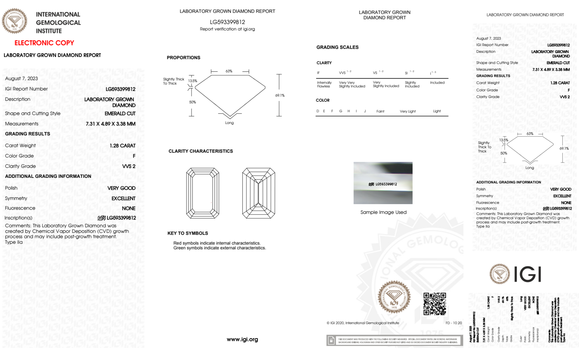 Your 1.28 carat Emerald lab diamond is graded F color (Colorless), and you can read more about F color diamonds here.
