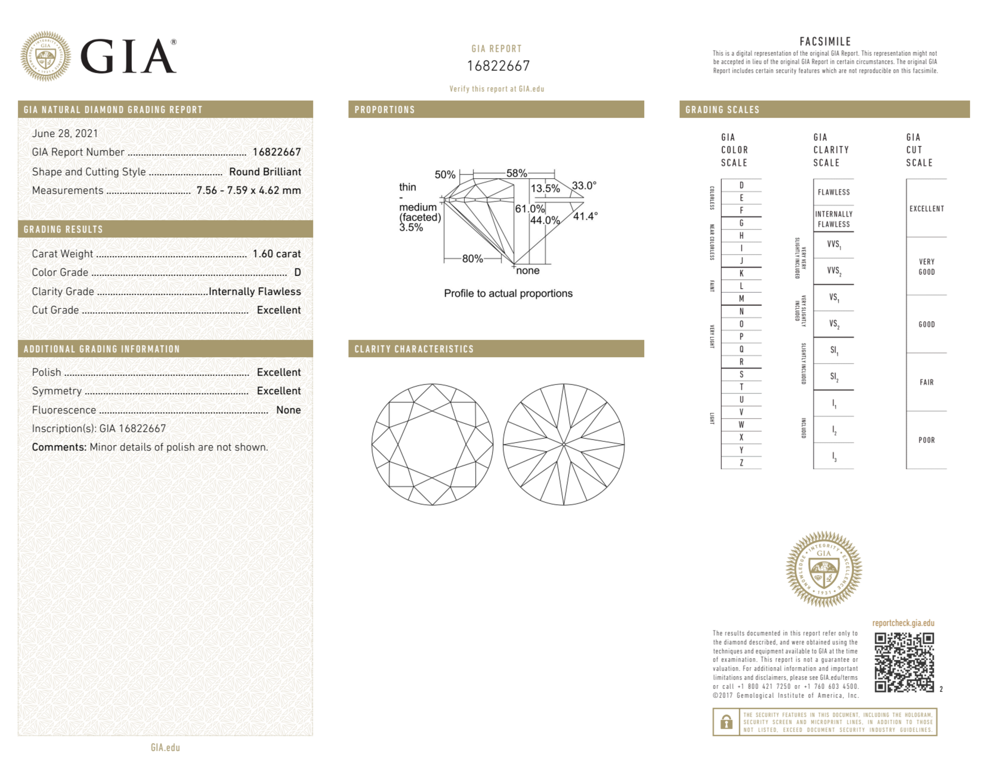 Your 1.60 carat Round natural diamond is graded IF clarity, which stands for Internally Flawless. Read more about IF clarity diamonds here, or learn more about diamond clarity in general here.