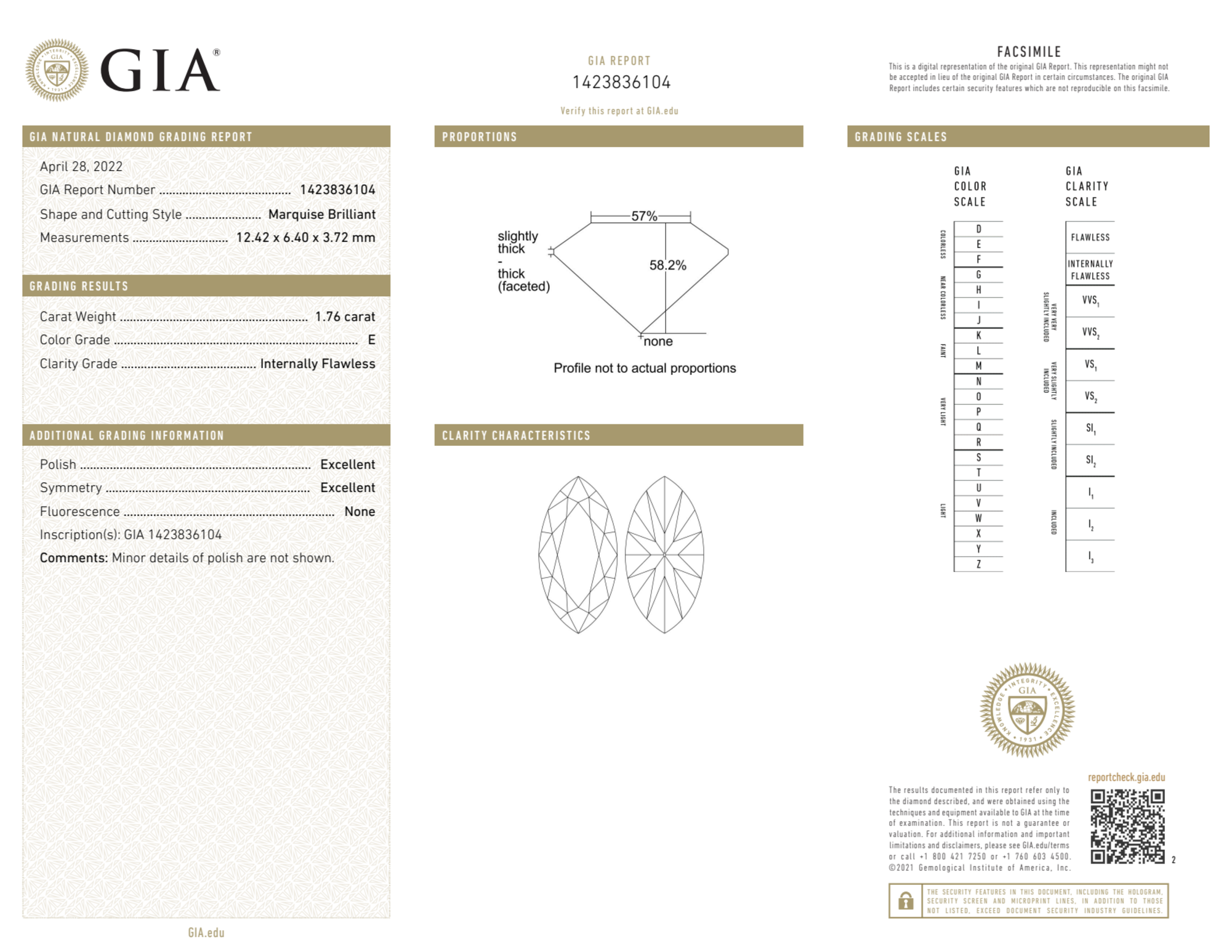 Your 1.76 carat Marquise natural diamond is graded IF clarity, which stands for Internally Flawless. Read more about IF clarity diamonds here, or learn more about diamond clarity in general here.