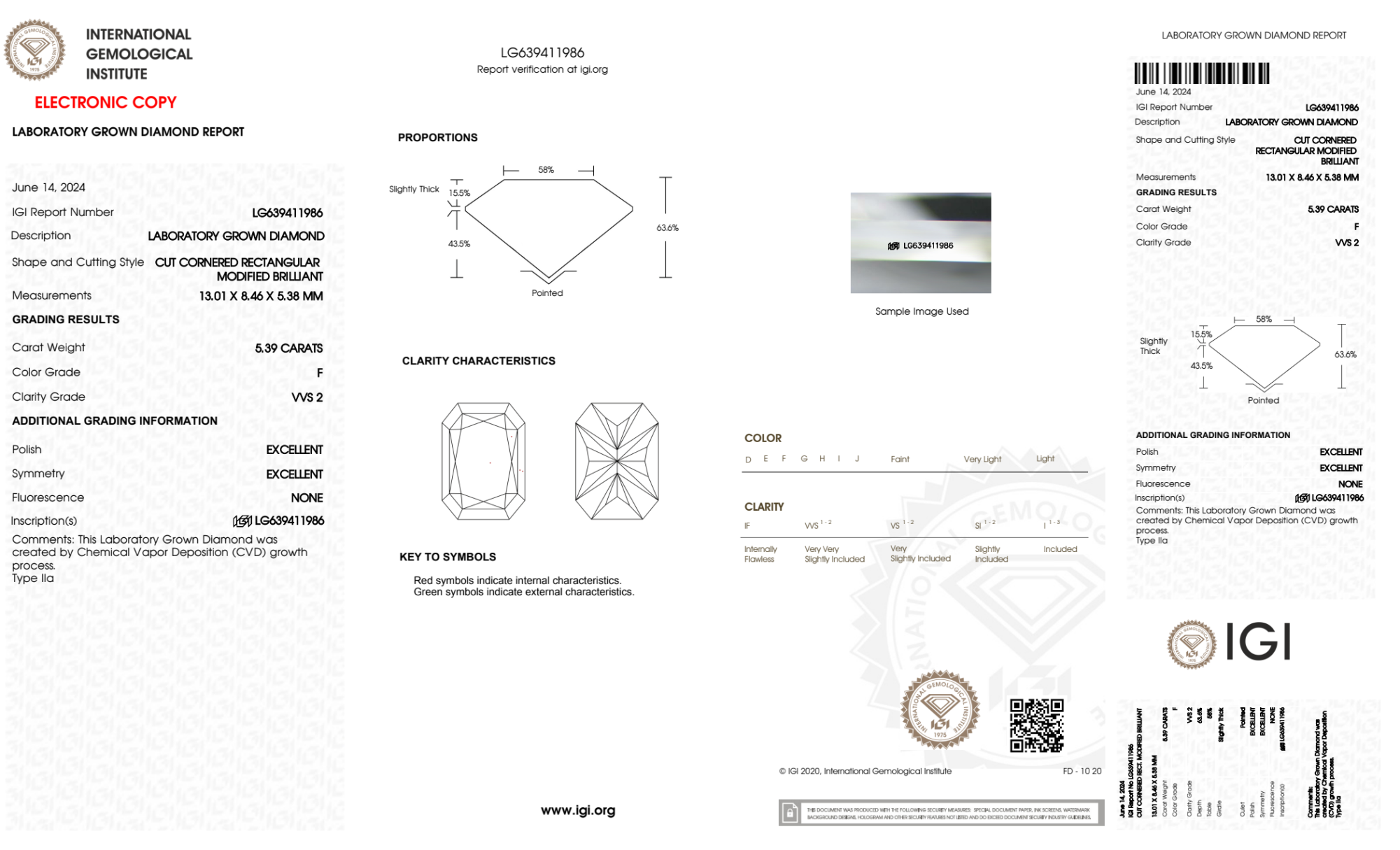 Your 5.39 carat Radiant lab diamond is graded F color (Colorless), and you can read more about F color diamonds here.