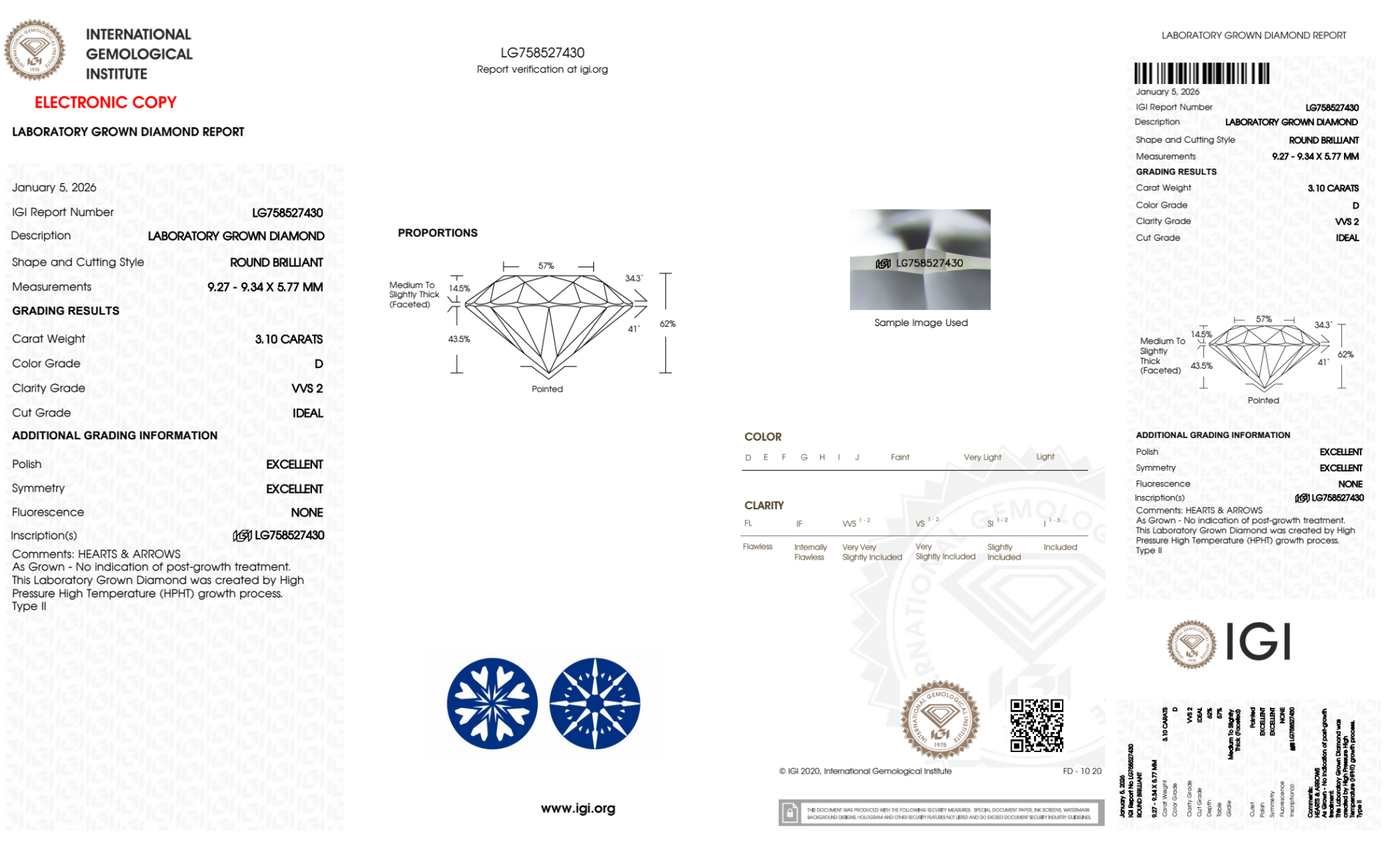 Your 3.10 carat Round lab diamond is graded D color (Colorless), and you can read more about D color diamonds here.