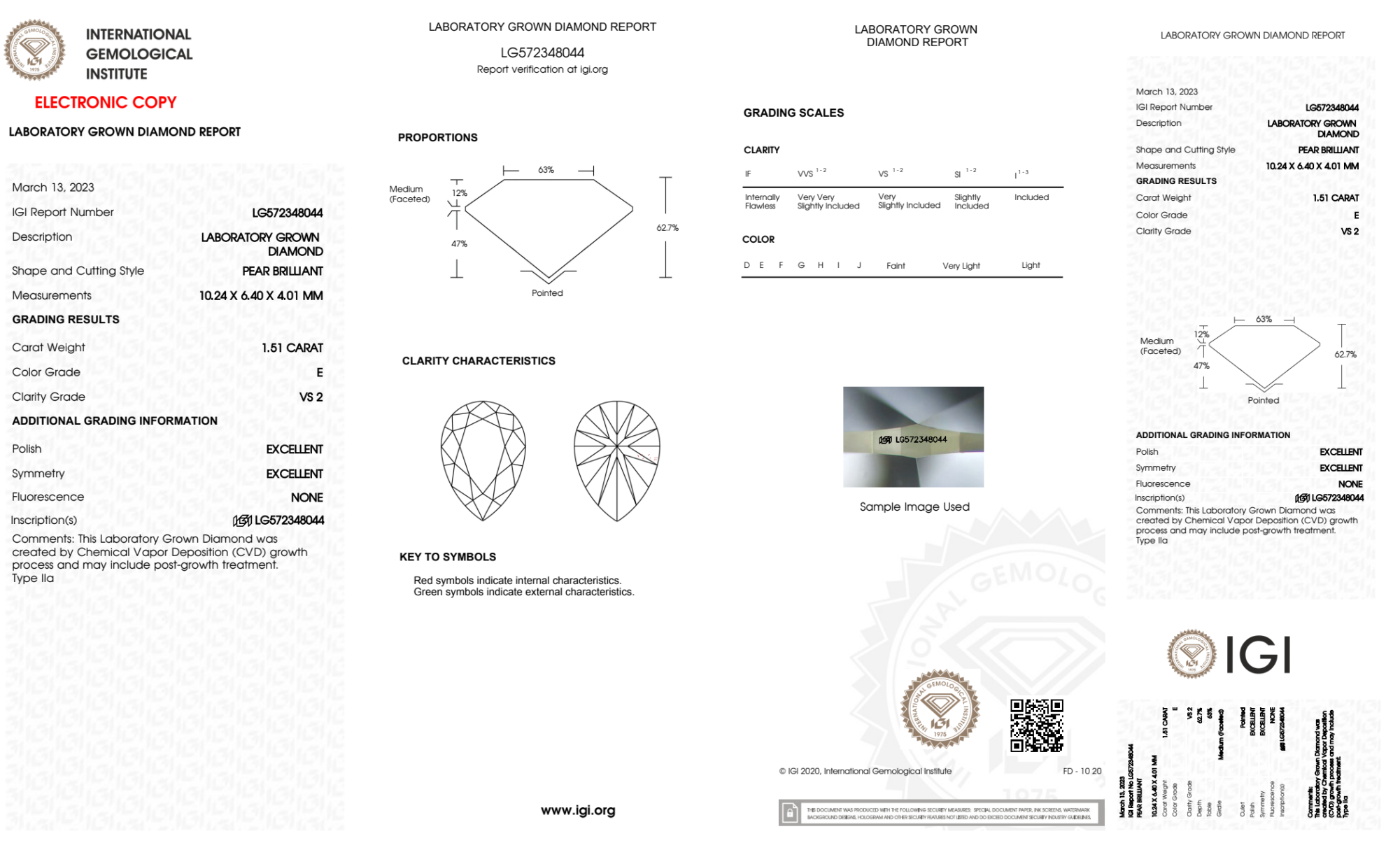 Your 1.51 carat Pear lab diamond is graded E color (Colorless), and you can read more about E color diamonds here.