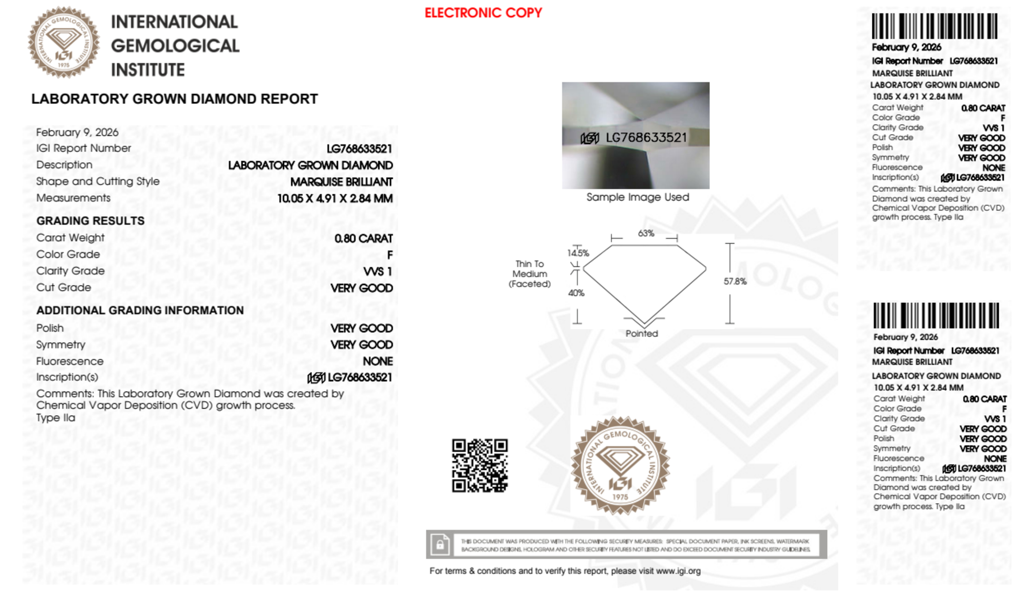 Your 0.80 carat Marquise lab diamond is graded F color (Colorless), and you can read more about F color diamonds here.
