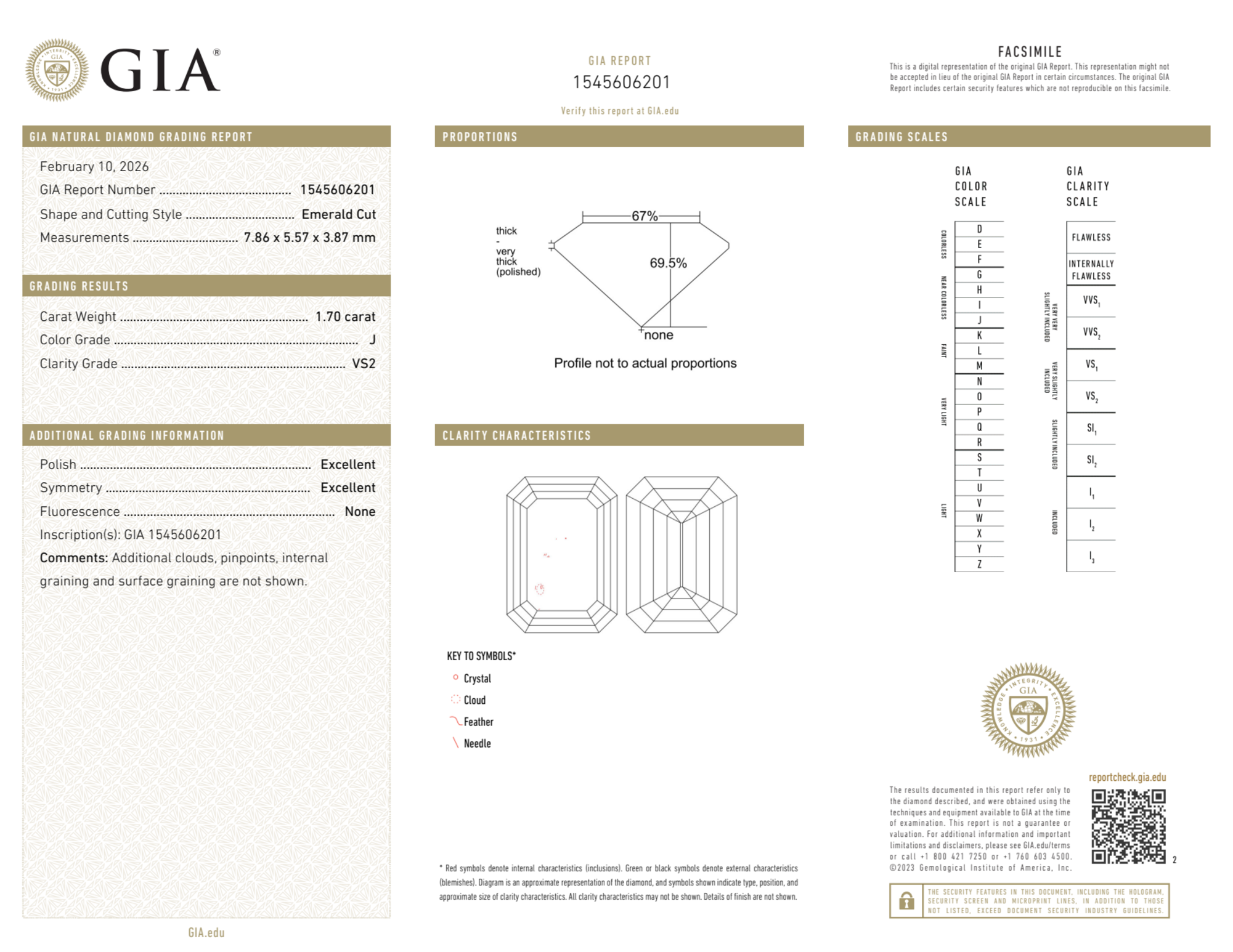 Your 1.70 carat Emerald natural diamond is graded VS2 clarity, which stands for Very Slightly Included 2. Read more about VS2 clarity diamonds here, or learn more about diamond clarity in general here.