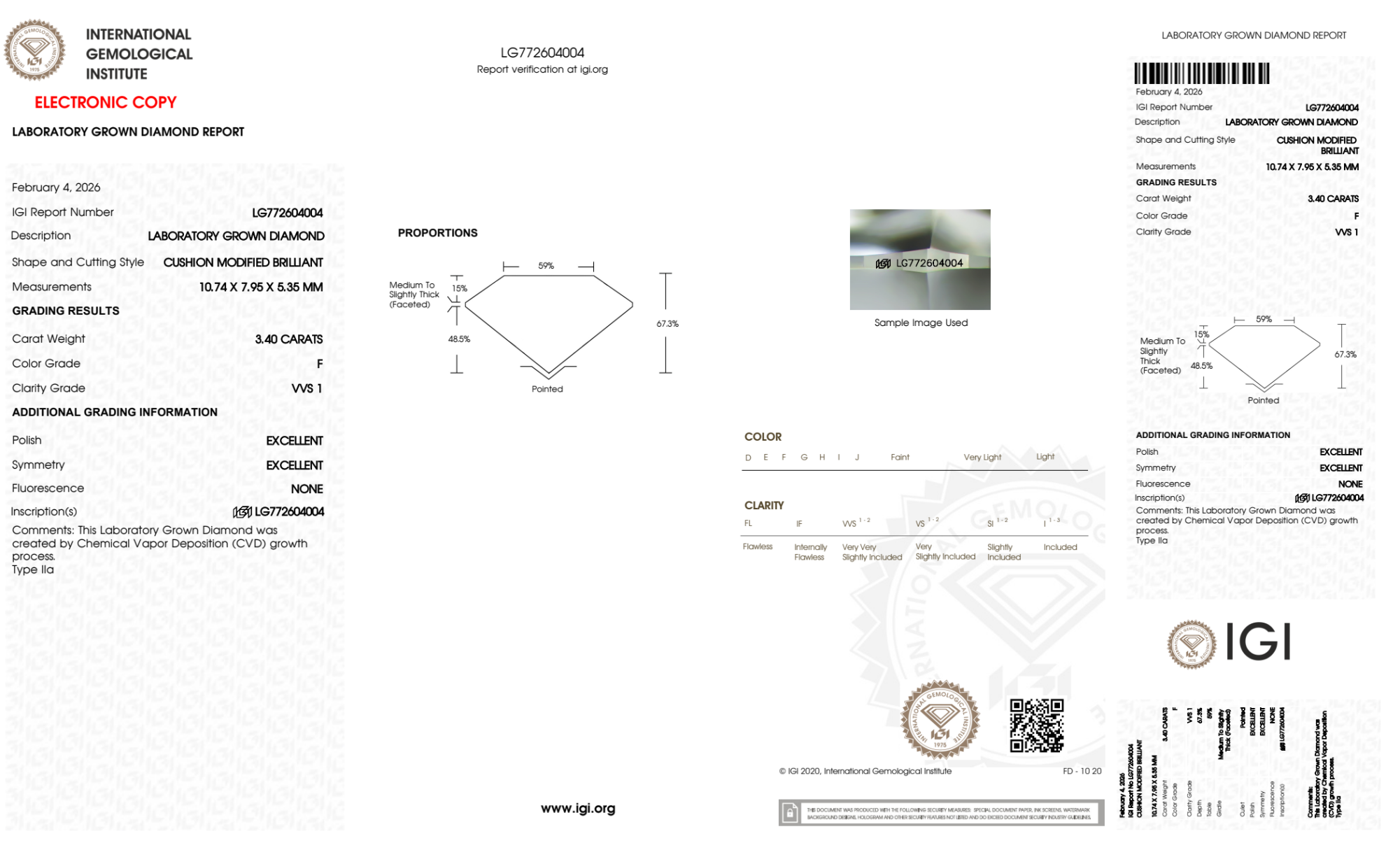 Your 3.40 carat Cushion lab diamond is graded F color (Colorless), and you can read more about F color diamonds here.