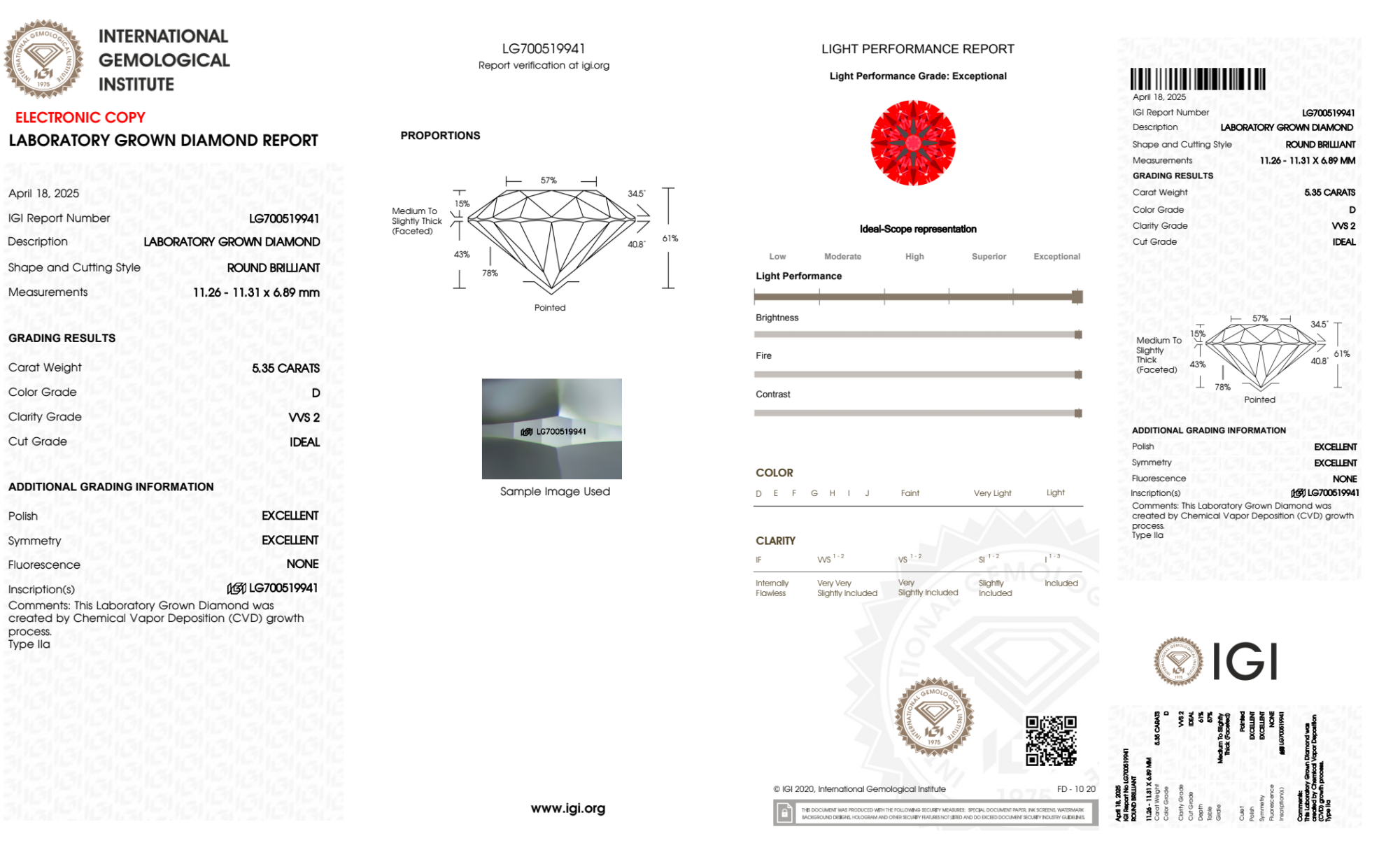 Your 5.35 carat Round lab diamond is graded D color (Colorless), and you can read more about D color diamonds here.