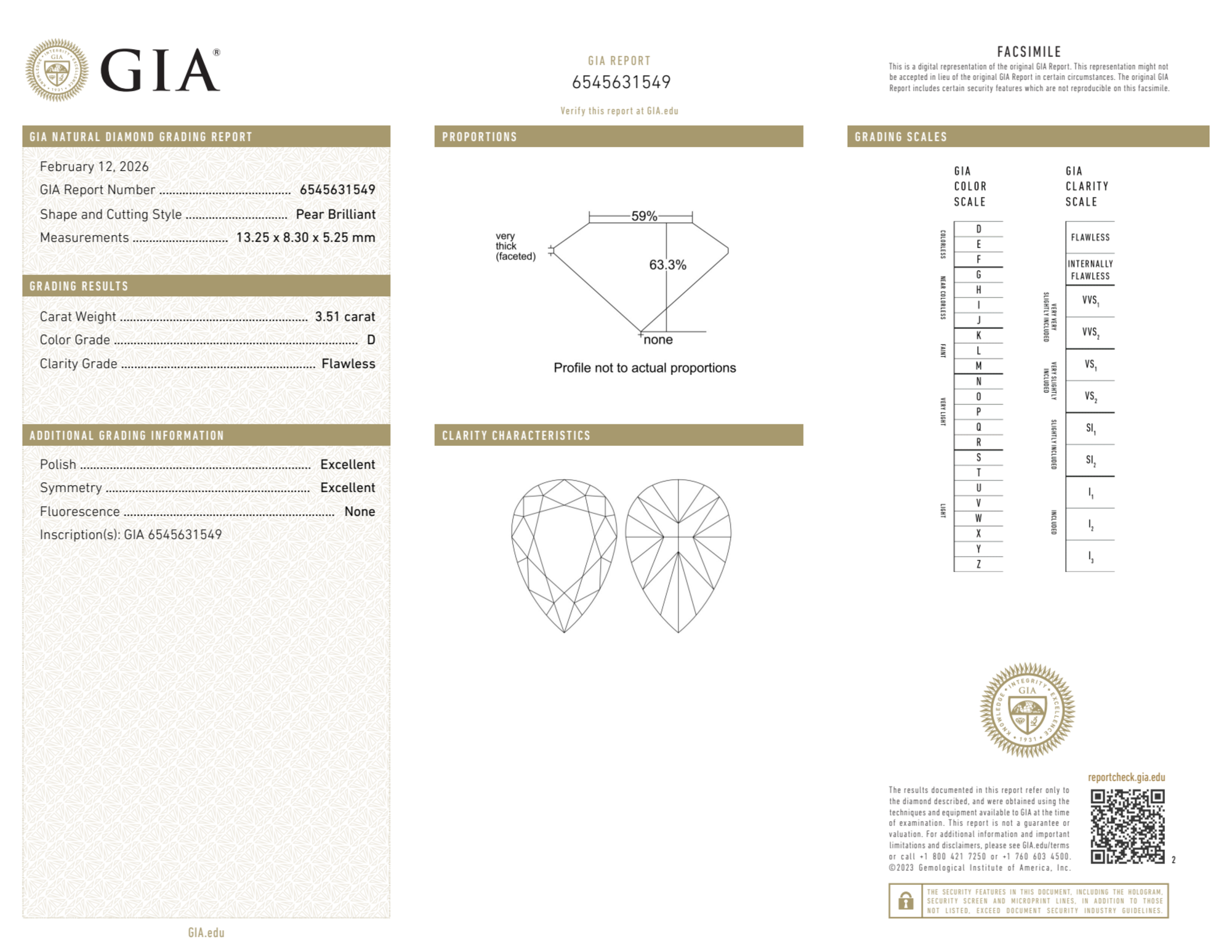 Your 3.51 carat Pear natural diamond is graded FL clarity, which stands for Flawless. Read more about FL clarity diamonds here, or learn more about diamond clarity in general here.