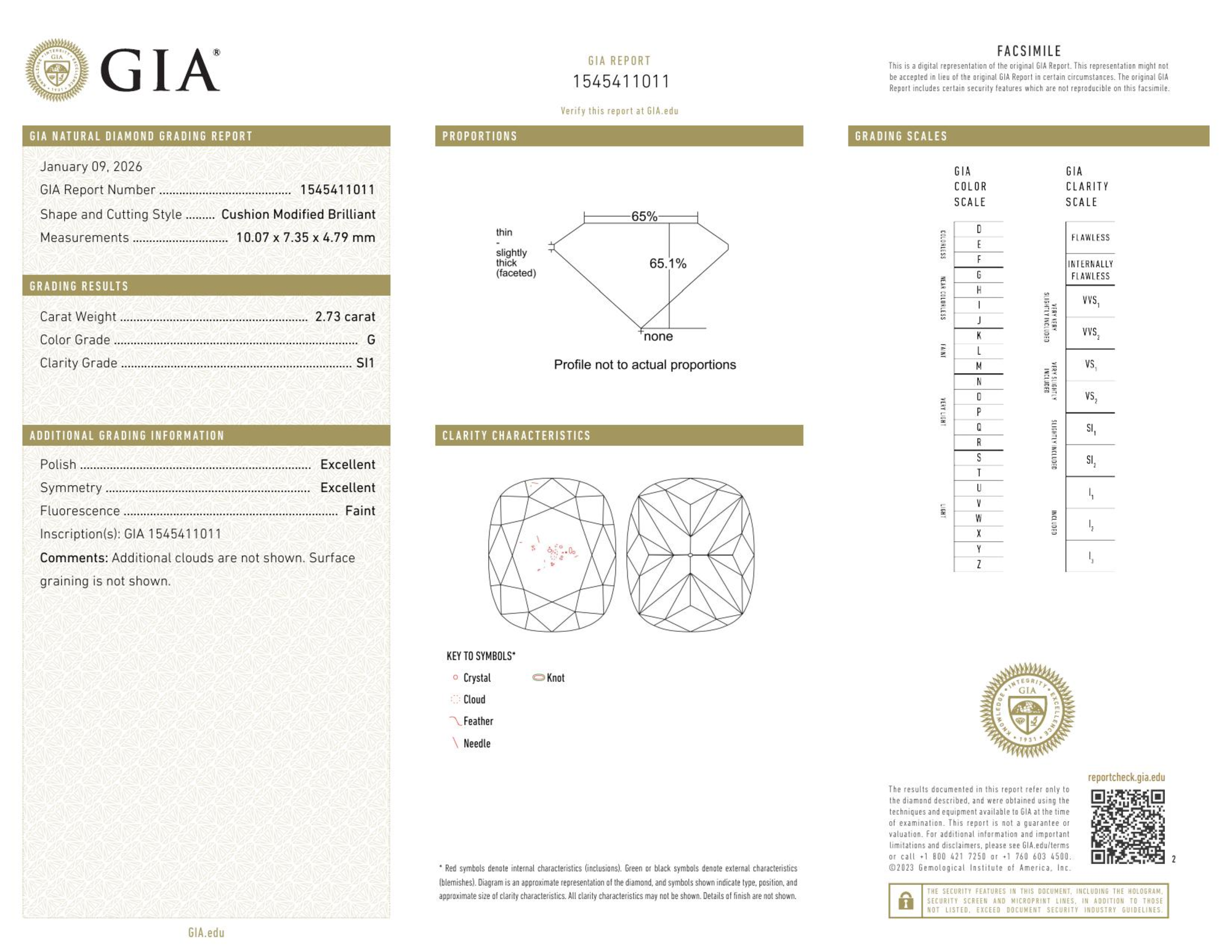 Your 2.73 carat Cushion natural diamond is graded G color (Near Colorless), and you can read more about G color diamonds here.