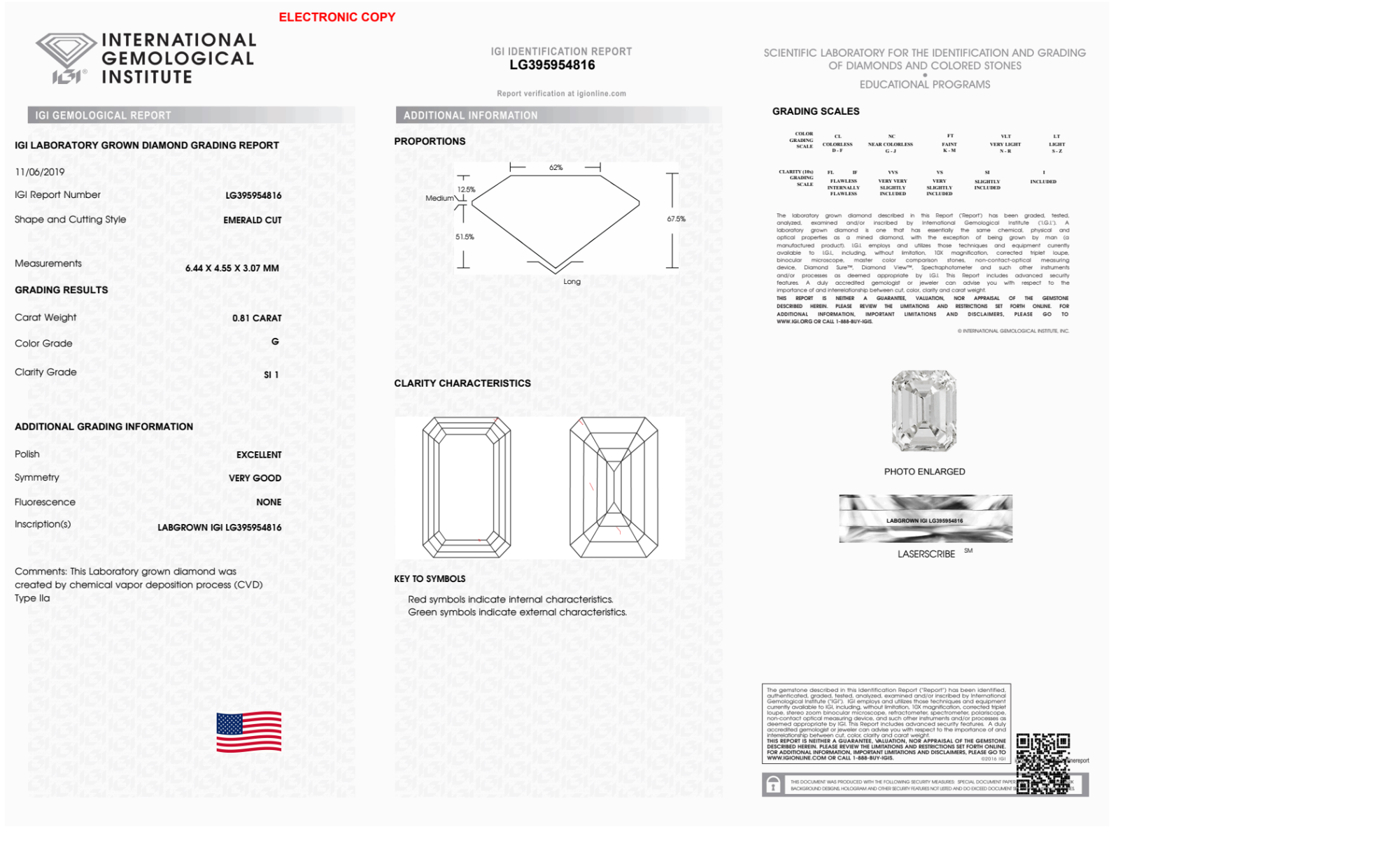 Your 0.81 carat Emerald lab diamond is graded SI1 clarity, which stands for Slightly Included 1. Read more about SI1 clarity diamonds here, or learn more about diamond clarity in general here.