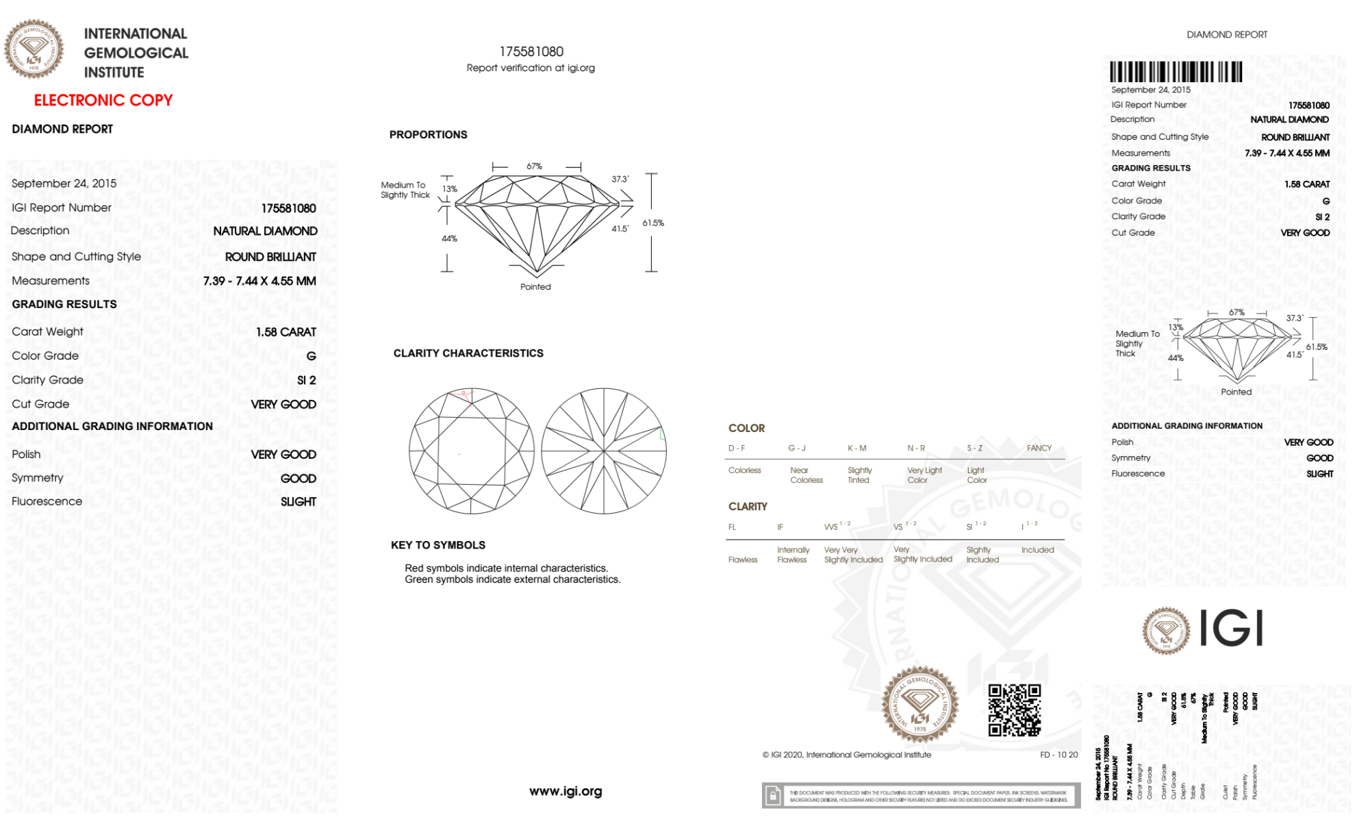Your 1.58 carat Round natural diamond is graded SI2 clarity, which stands for Slightly Included 2. Read more about SI2 clarity diamonds here, or learn more about diamond clarity in general here.