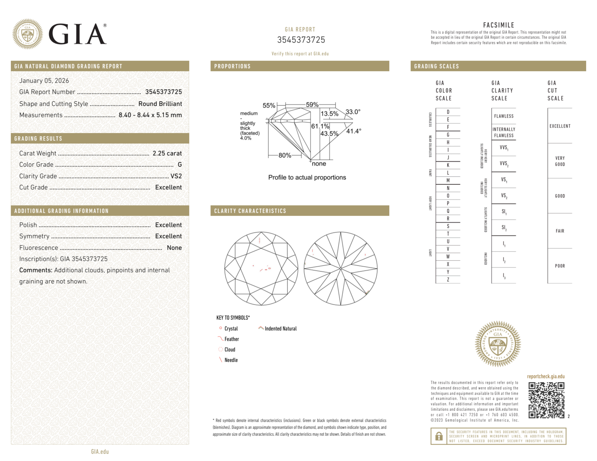 Your 2.25 carat Round natural diamond is graded G color (Near Colorless), and you can read more about G color diamonds here.