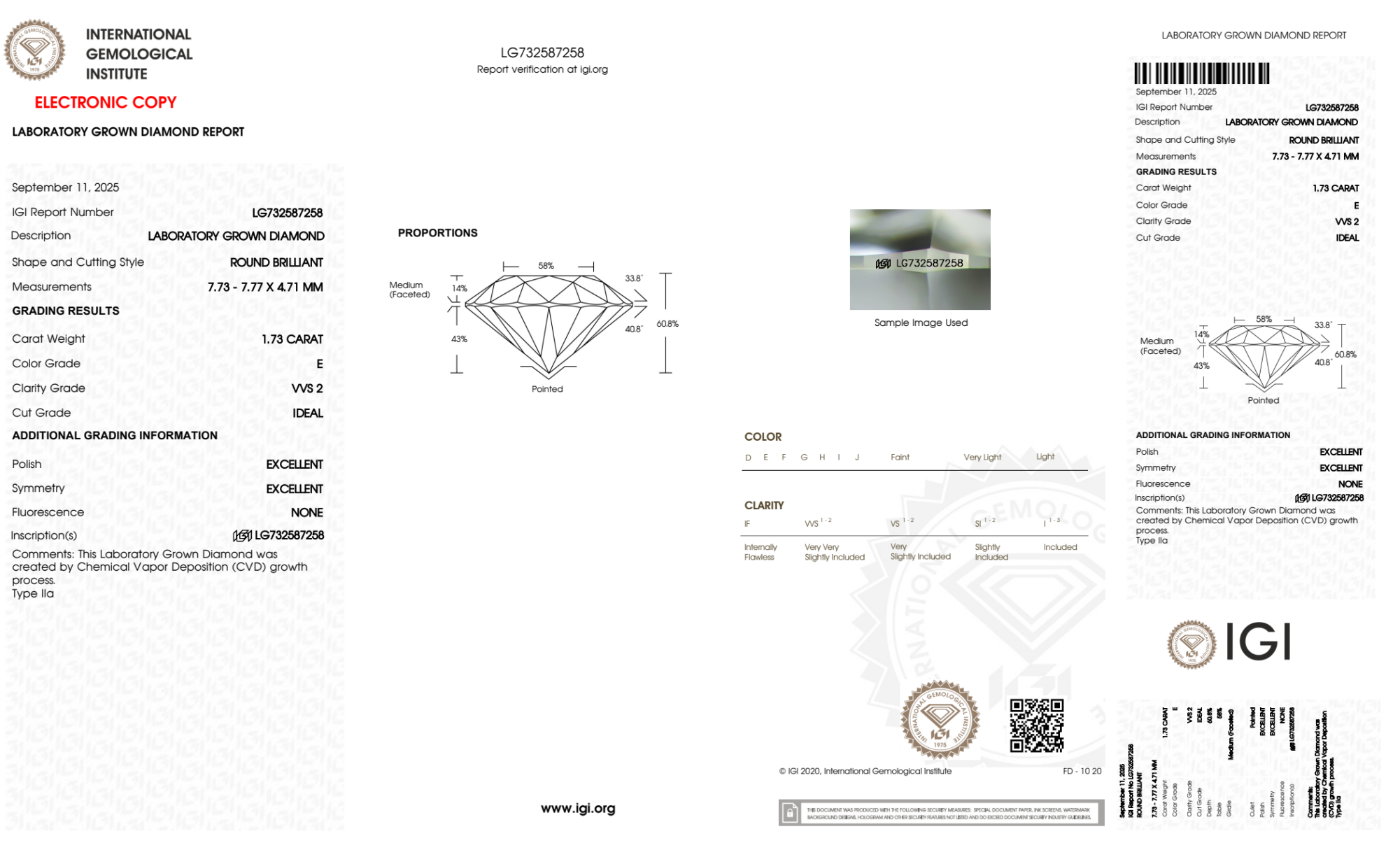 Your 1.73 carat Round lab diamond is graded E color (Colorless), and you can read more about E color diamonds here.