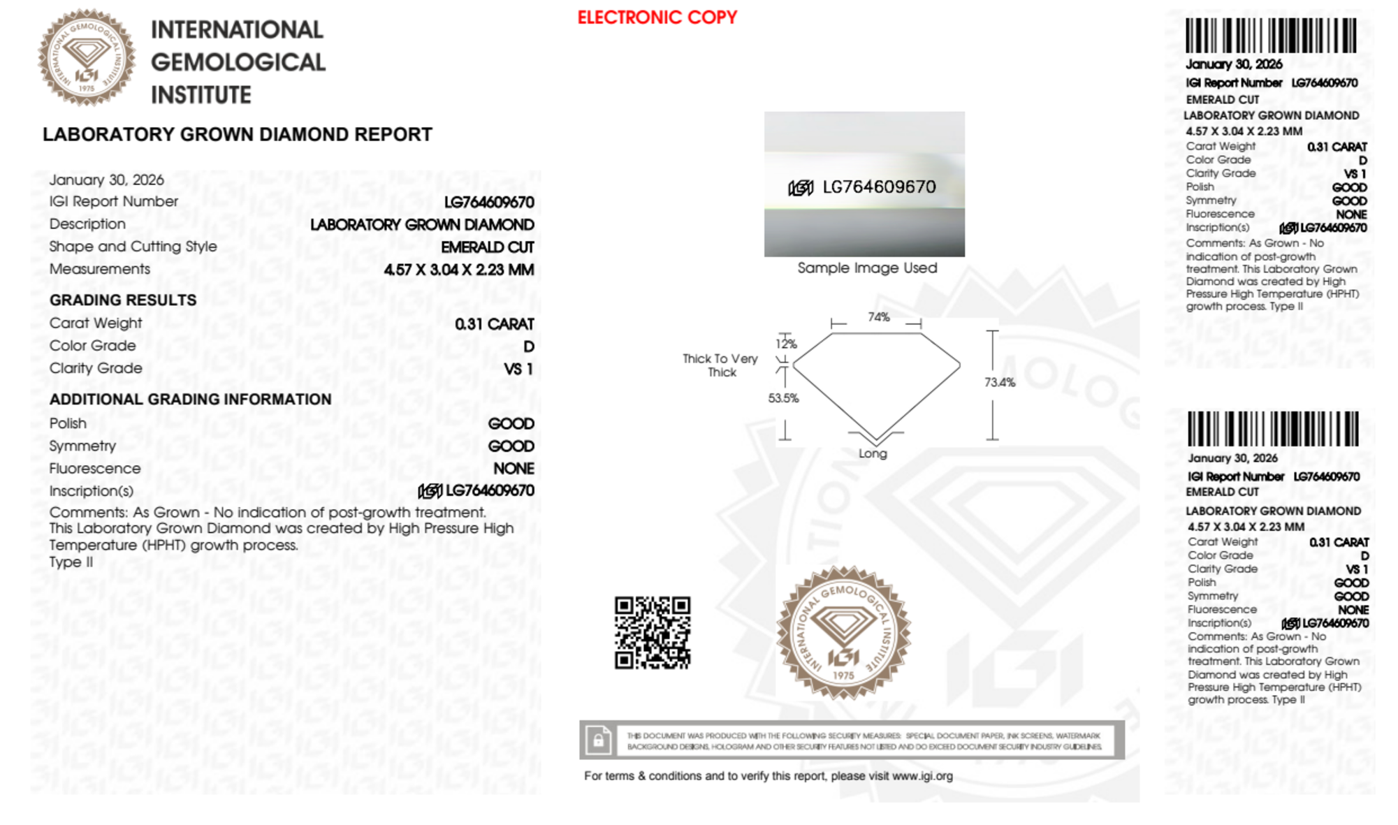Your 0.31 carat Emerald lab diamond is graded D color (Colorless), and you can read more about D color diamonds here.