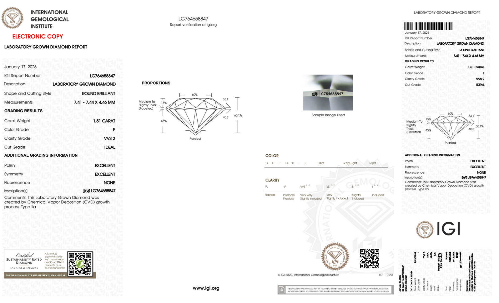 Your 1.51 carat Round lab diamond is graded F color (Colorless), and you can read more about F color diamonds here.
