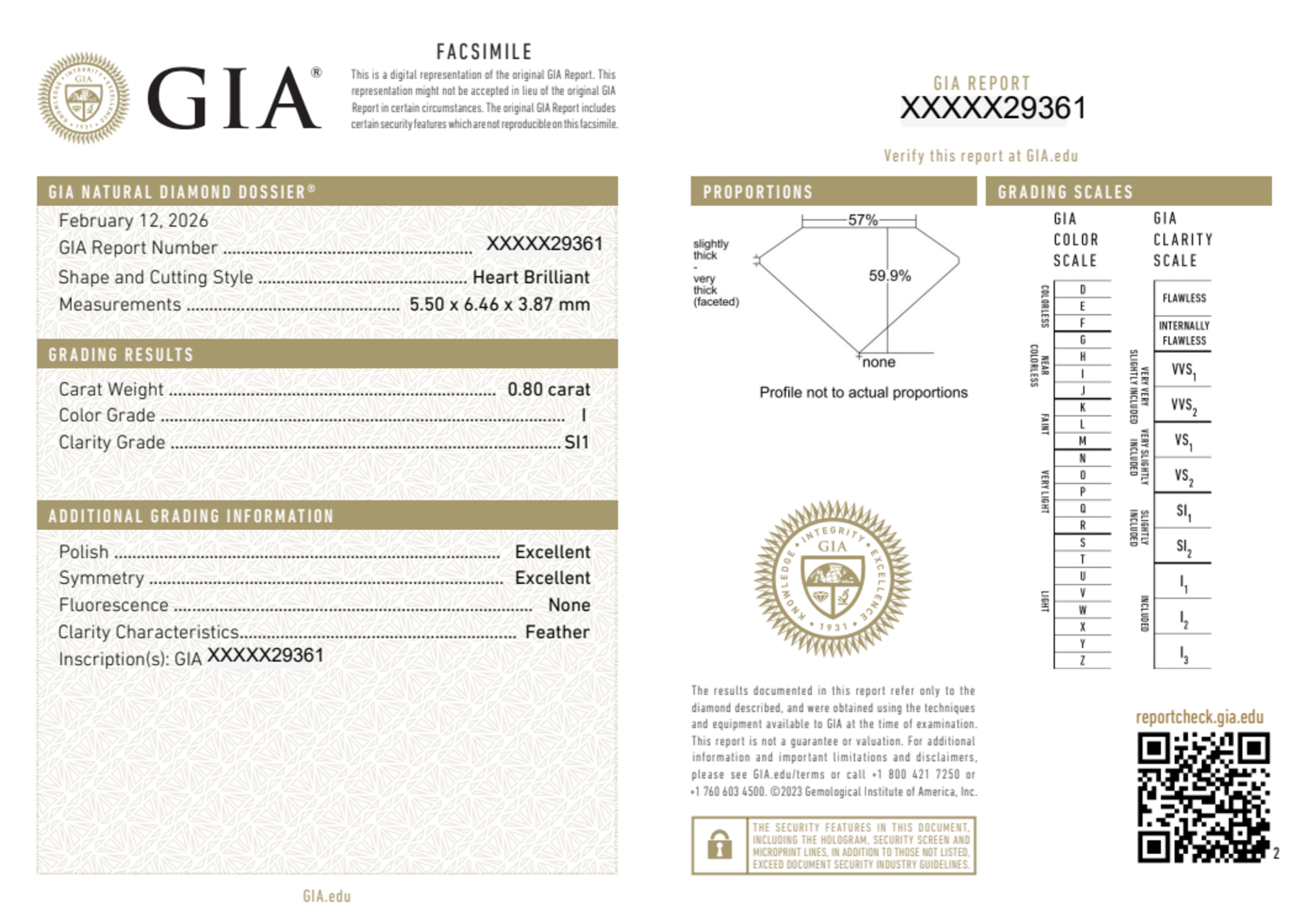 Your 0.80 carat Heart natural diamond is graded SI1 clarity, which stands for Slightly Included 1. Read more about SI1 clarity diamonds here, or learn more about diamond clarity in general here.