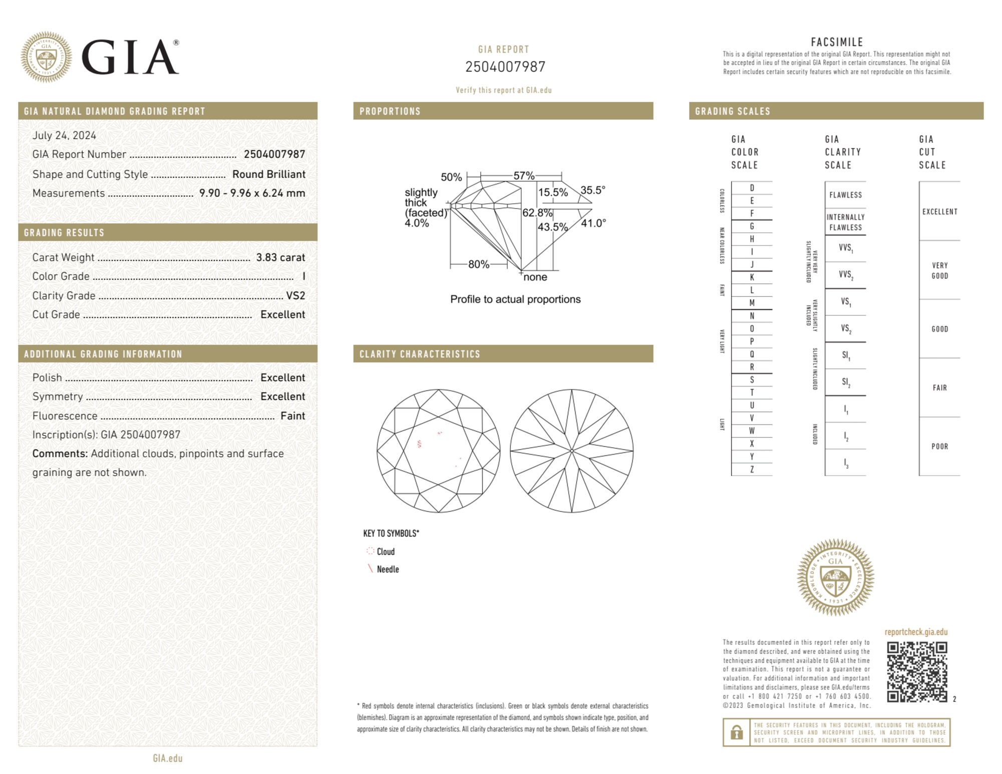 Your 3.83 carat Round natural diamond is graded VS2 clarity, which stands for Very Slightly Included 2. Read more about VS2 clarity diamonds here, or learn more about diamond clarity in general here.