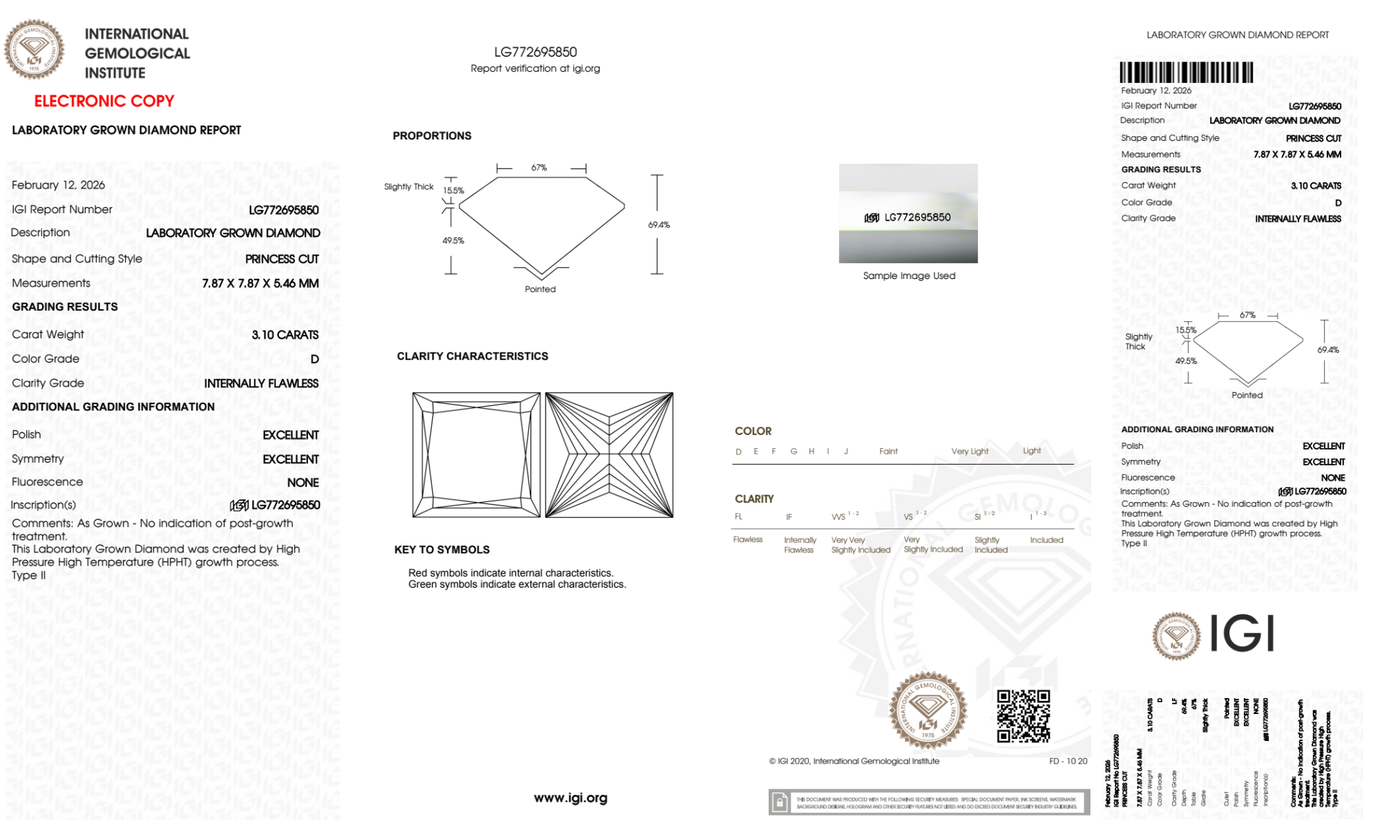 Your 3.10 carat Princess lab diamond is graded IF clarity, which stands for Internally Flawless. Read more about IF clarity diamonds here, or learn more about diamond clarity in general here.