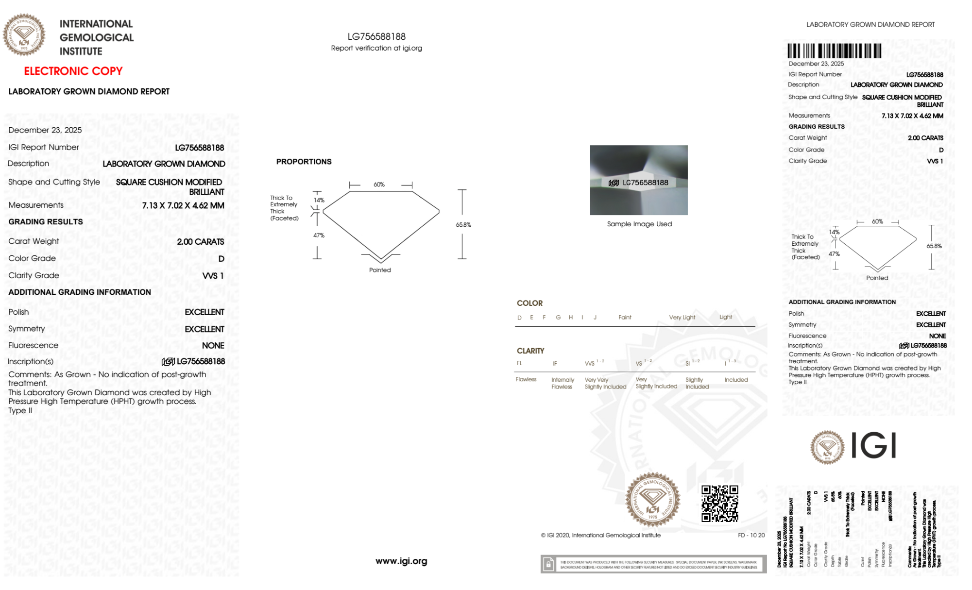 Your 2.00 carat Cushion lab diamond is graded D color (Colorless), and you can read more about D color diamonds here.