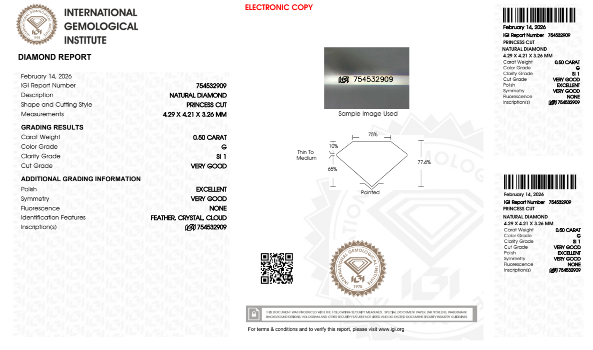 Your 0.50 carat Princess natural diamond is graded SI1 clarity, which stands for Slightly Included 1. Read more about SI1 clarity diamonds here, or learn more about diamond clarity in general here.
