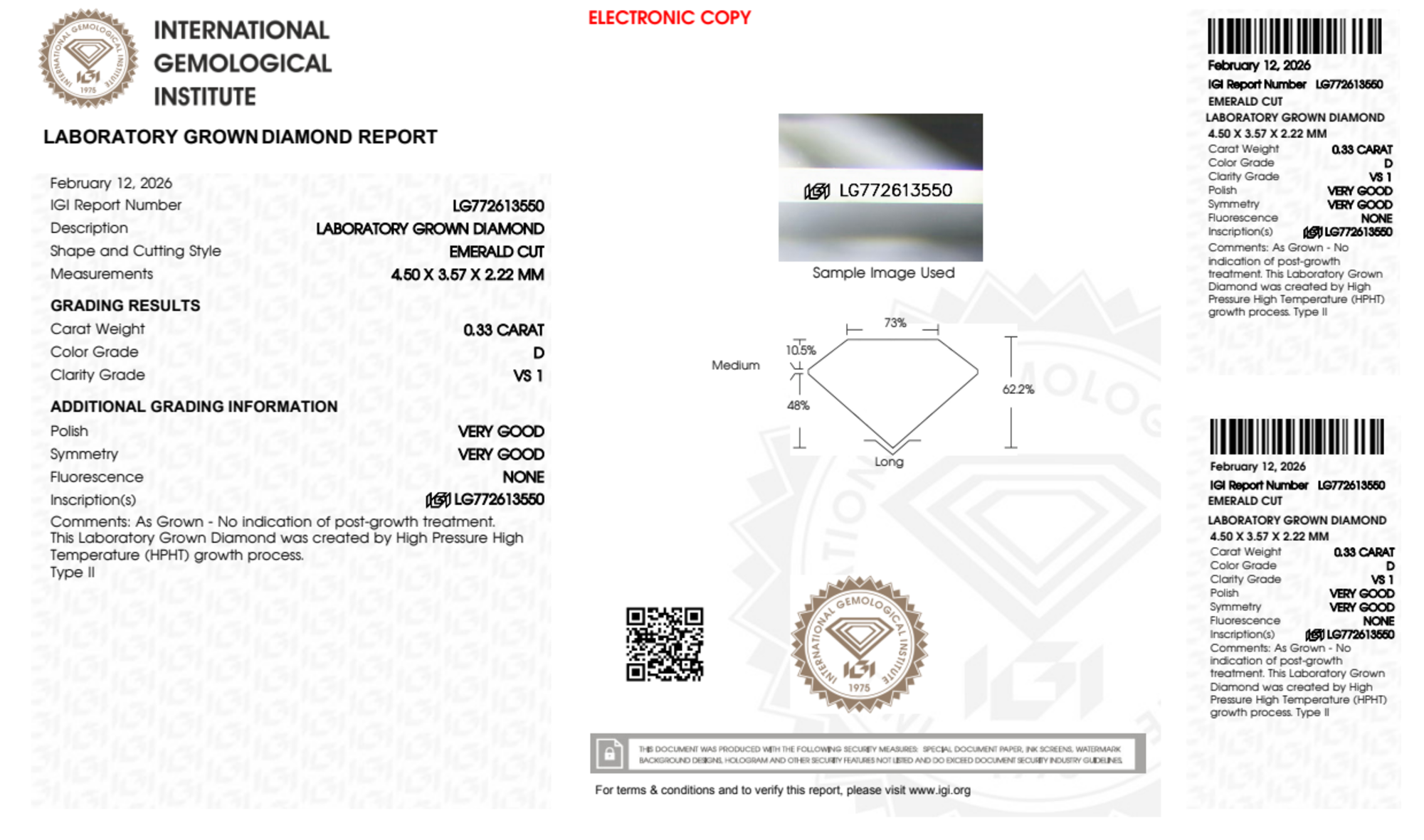 Your 0.33 carat Emerald lab diamond is graded D color (Colorless), and you can read more about D color diamonds here.