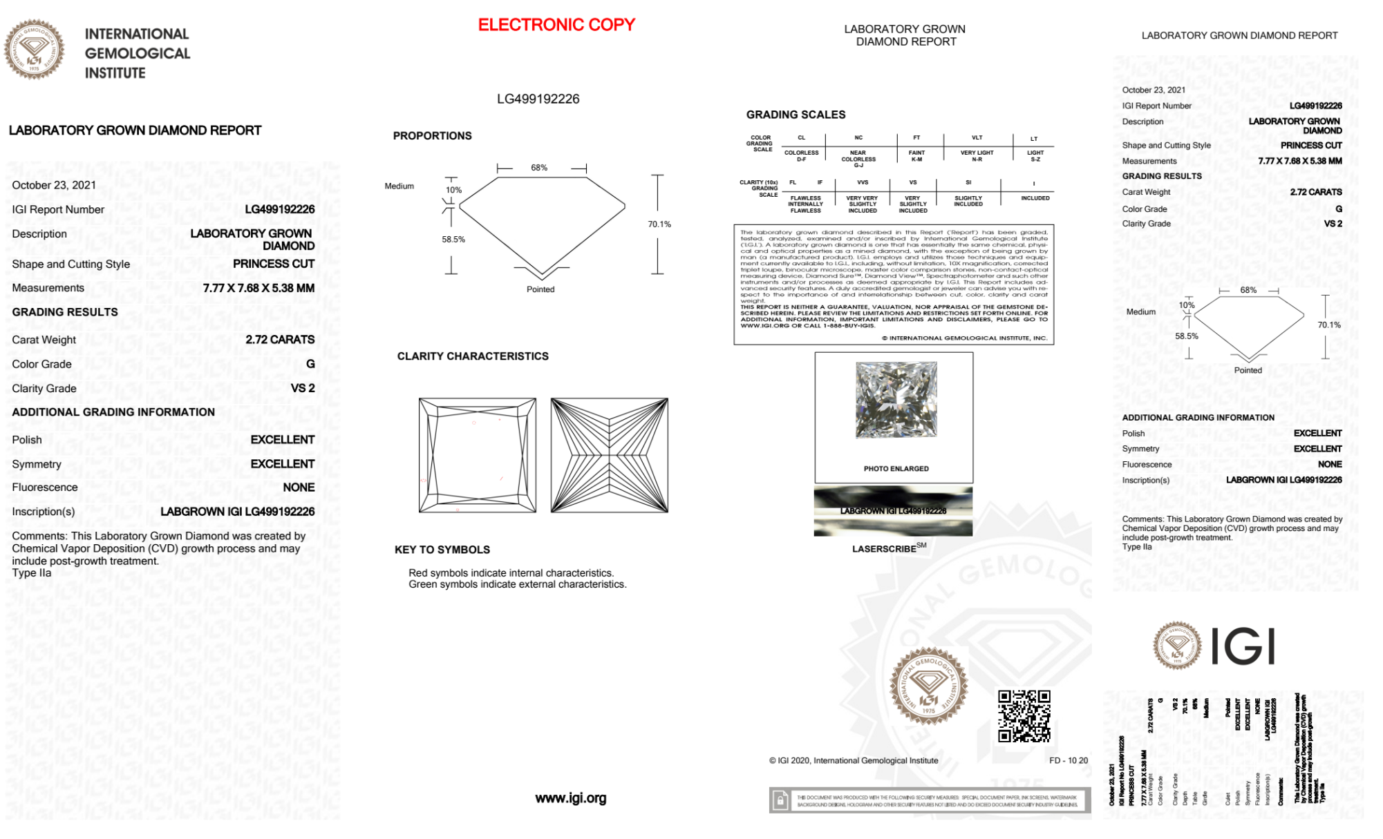 Your 2.72 carat Princess lab diamond is graded G color (Near Colorless), and you can read more about G color diamonds here.