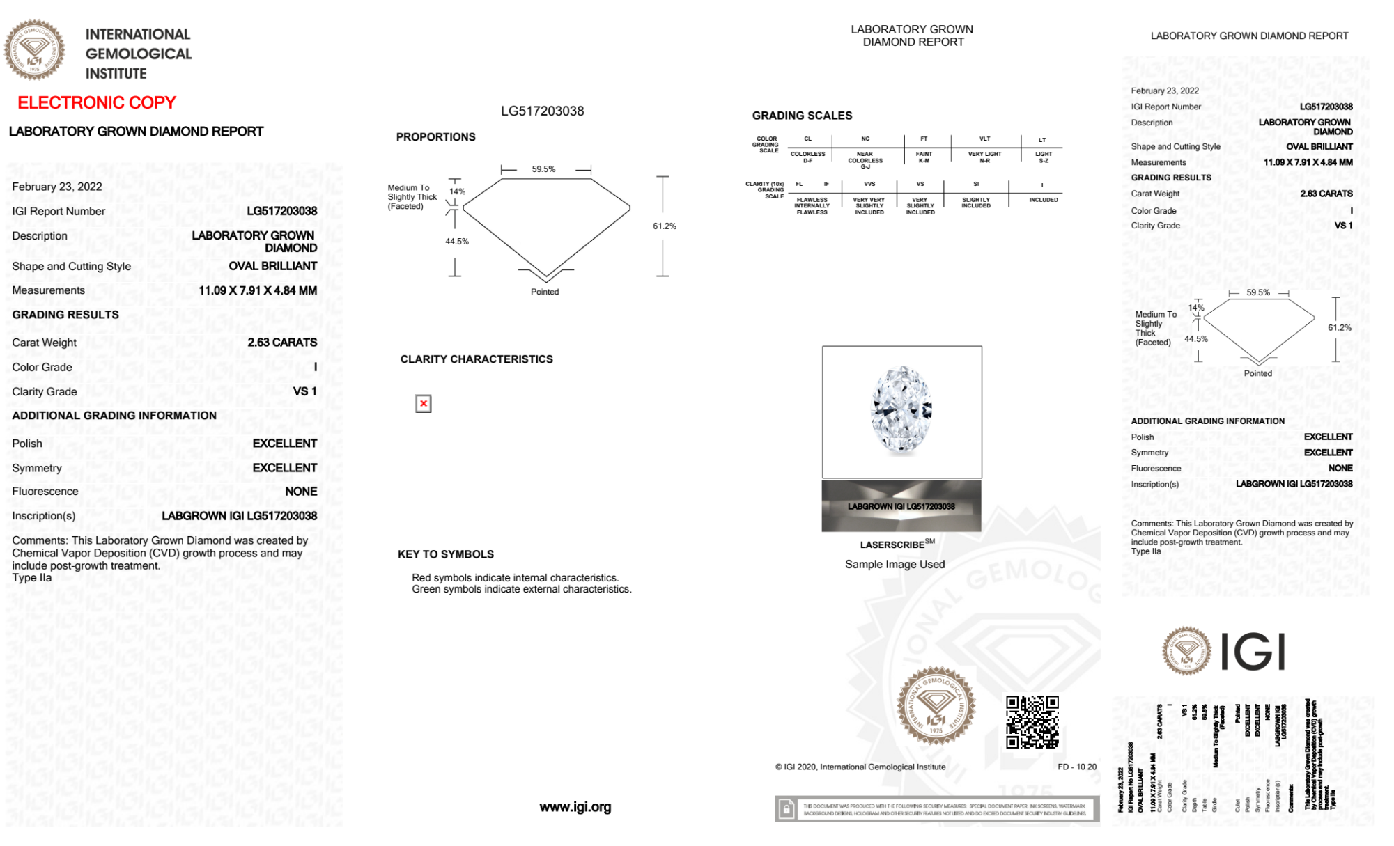 Your 2.63 carat Oval lab diamond is graded I color (Near Colorless), and you can read more about I color diamonds here.