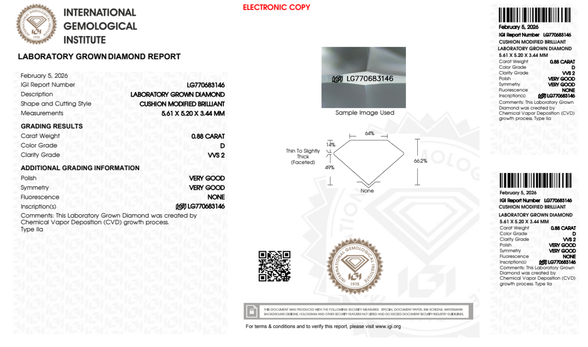 Your 0.88 carat Cushion lab diamond is graded D color (Colorless), and you can read more about D color diamonds here.