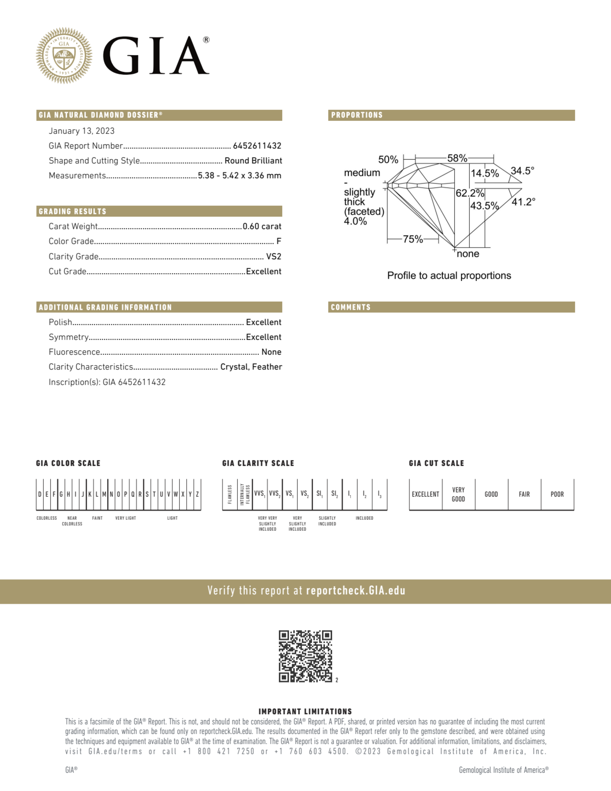 Your 0.60 carat Round natural diamond is graded F color (Colorless), and you can read more about F color diamonds here.