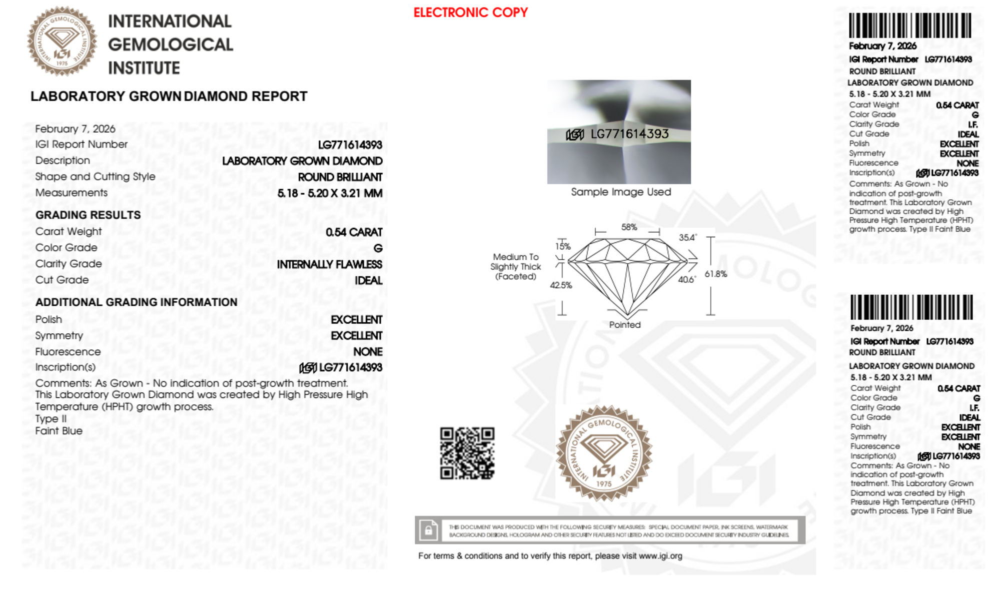 Your 0.54 carat Round lab diamond is graded IF clarity, which stands for Internally Flawless. Read more about IF clarity diamonds here, or learn more about diamond clarity in general here.