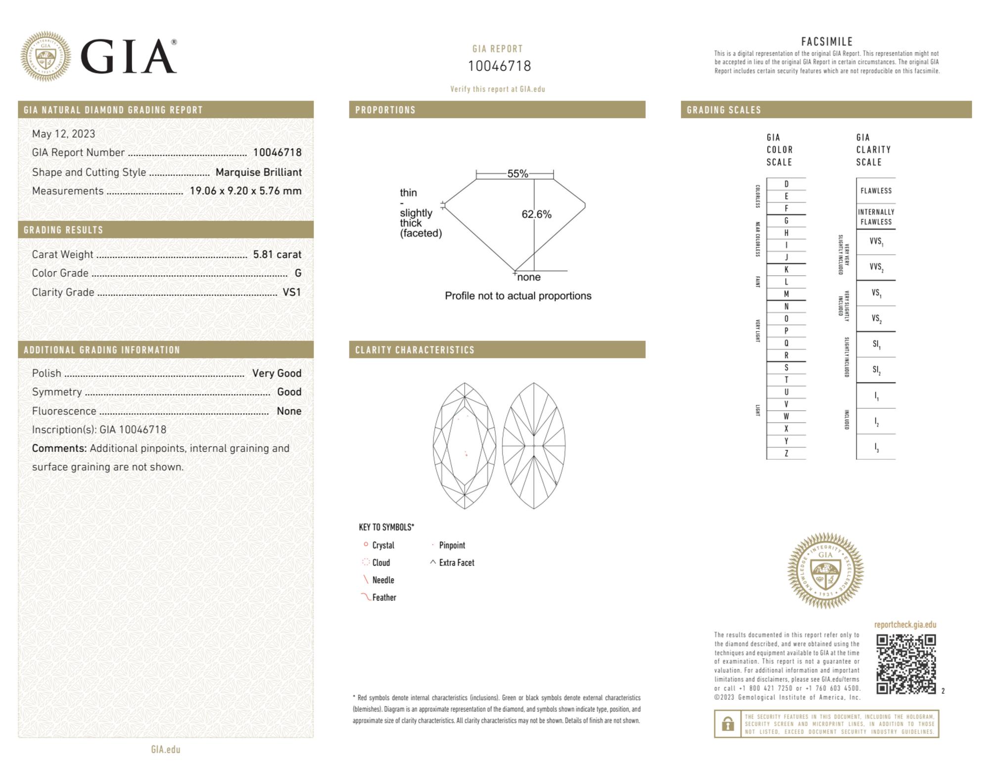 Your 5.77 carat Marquise natural diamond is graded G color (Near Colorless), and you can read more about G color diamonds here.
