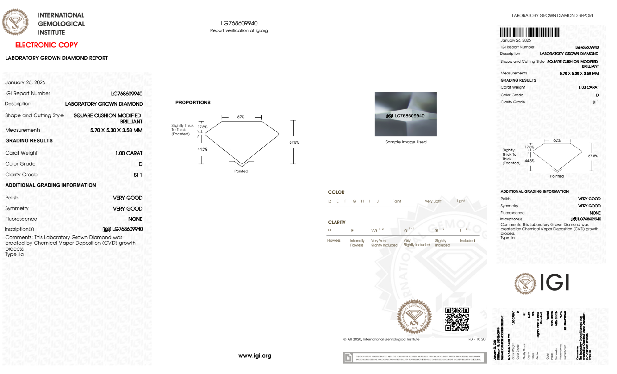 Your 1.00 carat Cushion lab diamond is graded D color (Colorless), and you can read more about D color diamonds here.