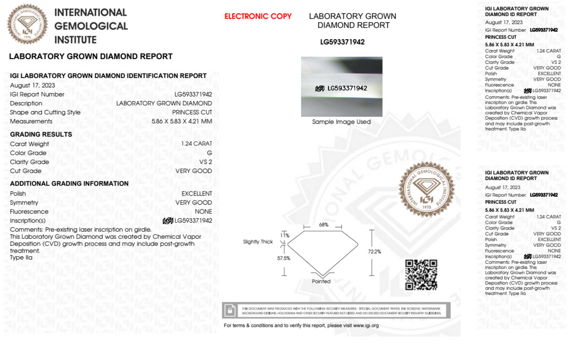 Your 1.24 carat Princess lab diamond is graded G color (Near Colorless), and you can read more about G color diamonds here.