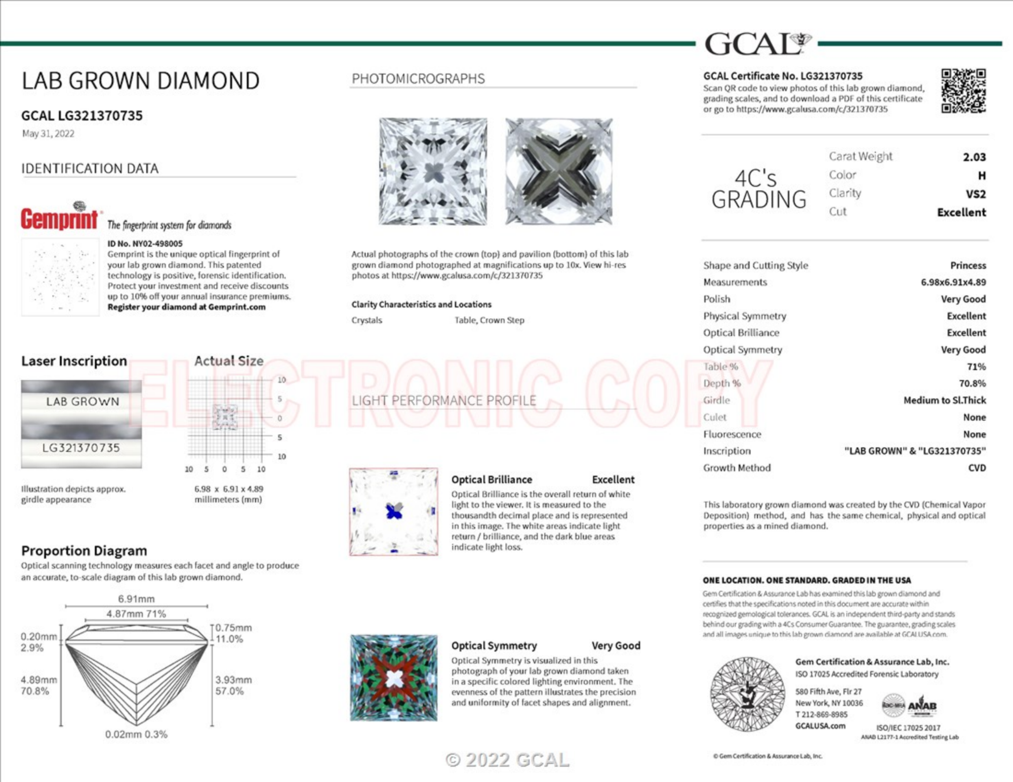 Your 2.03 carat Princess lab diamond is graded H color (Near Colorless), and you can read more about H color diamonds here.