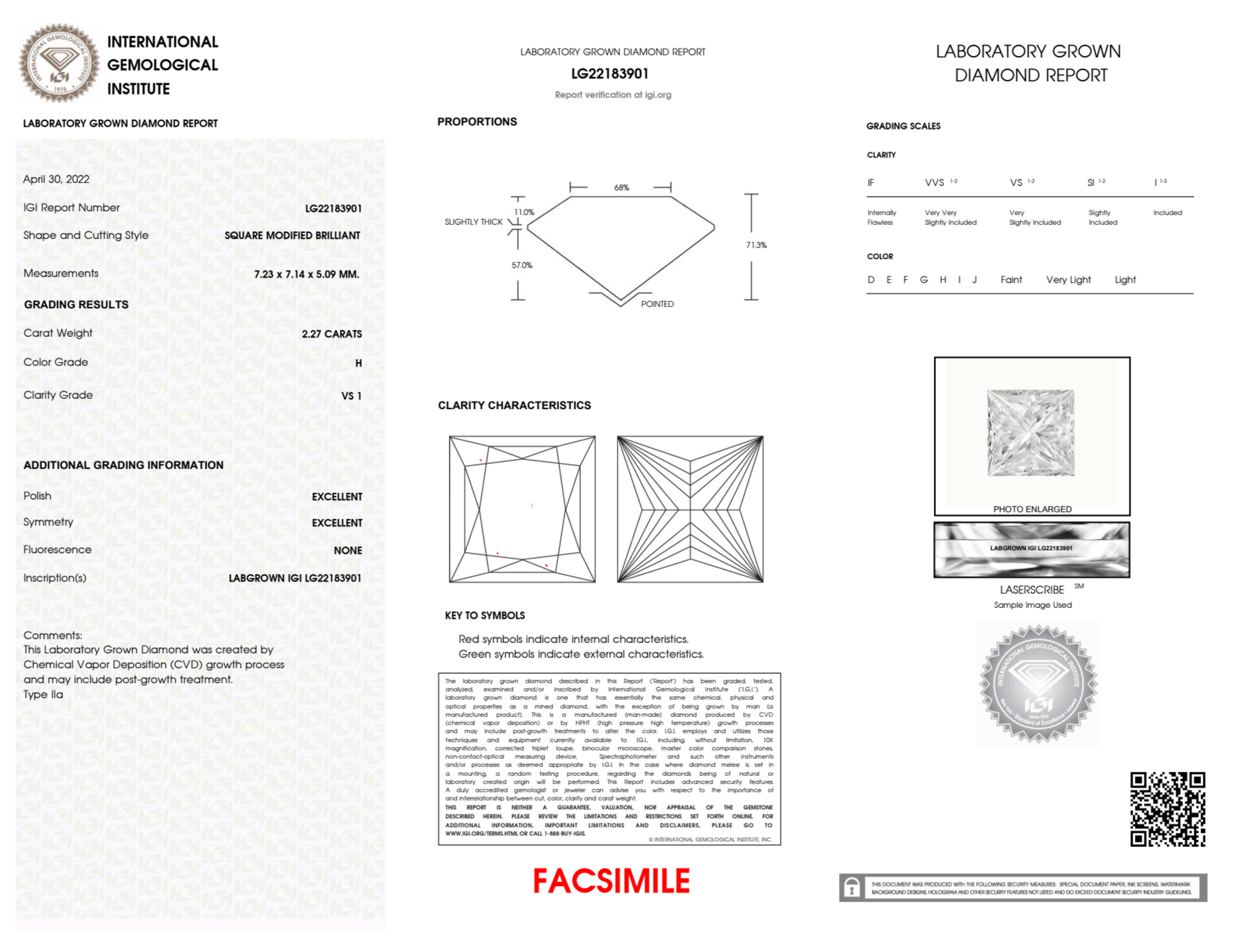 Your 2.27 carat Princess lab diamond is graded H color (Near Colorless), and you can read more about H color diamonds here.