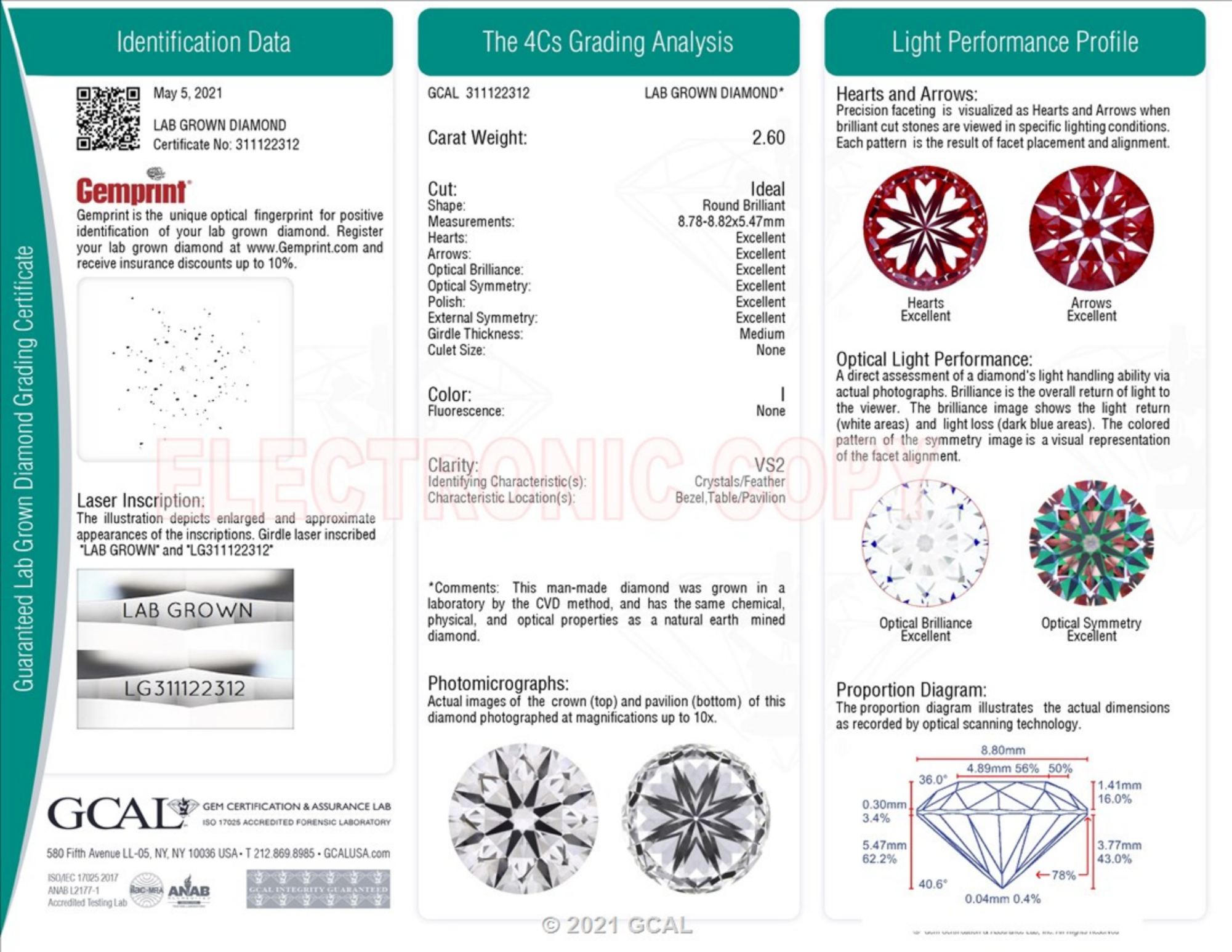 Your 2.60 carat Round lab diamond is graded VS2 clarity, which stands for Very Slightly Included 2. Read more about VS2 clarity diamonds here, or learn more about diamond clarity in general here.