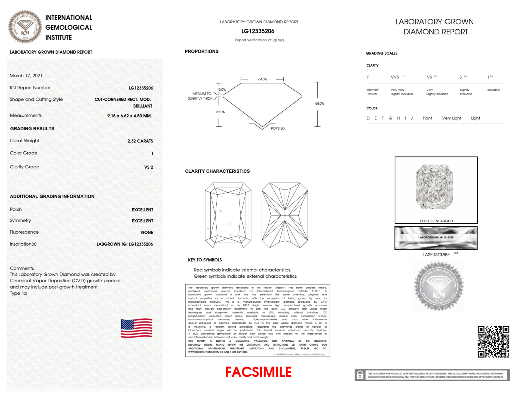 Your 2.32 carat Radiant lab diamond is graded VS2 clarity, which stands for Very Slightly Included 2. Read more about VS2 clarity diamonds here, or learn more about diamond clarity in general here.