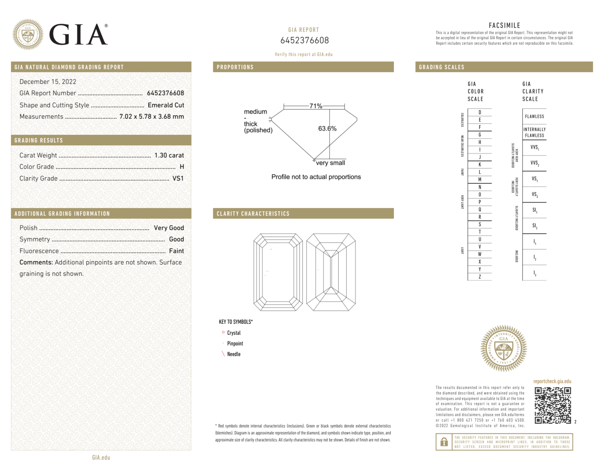 Your 1.30 carat Emerald natural diamond is graded VS1 clarity, which stands for Very Slightly Included 1. Read more about VS1 clarity diamonds here, or learn more about diamond clarity in general here.
