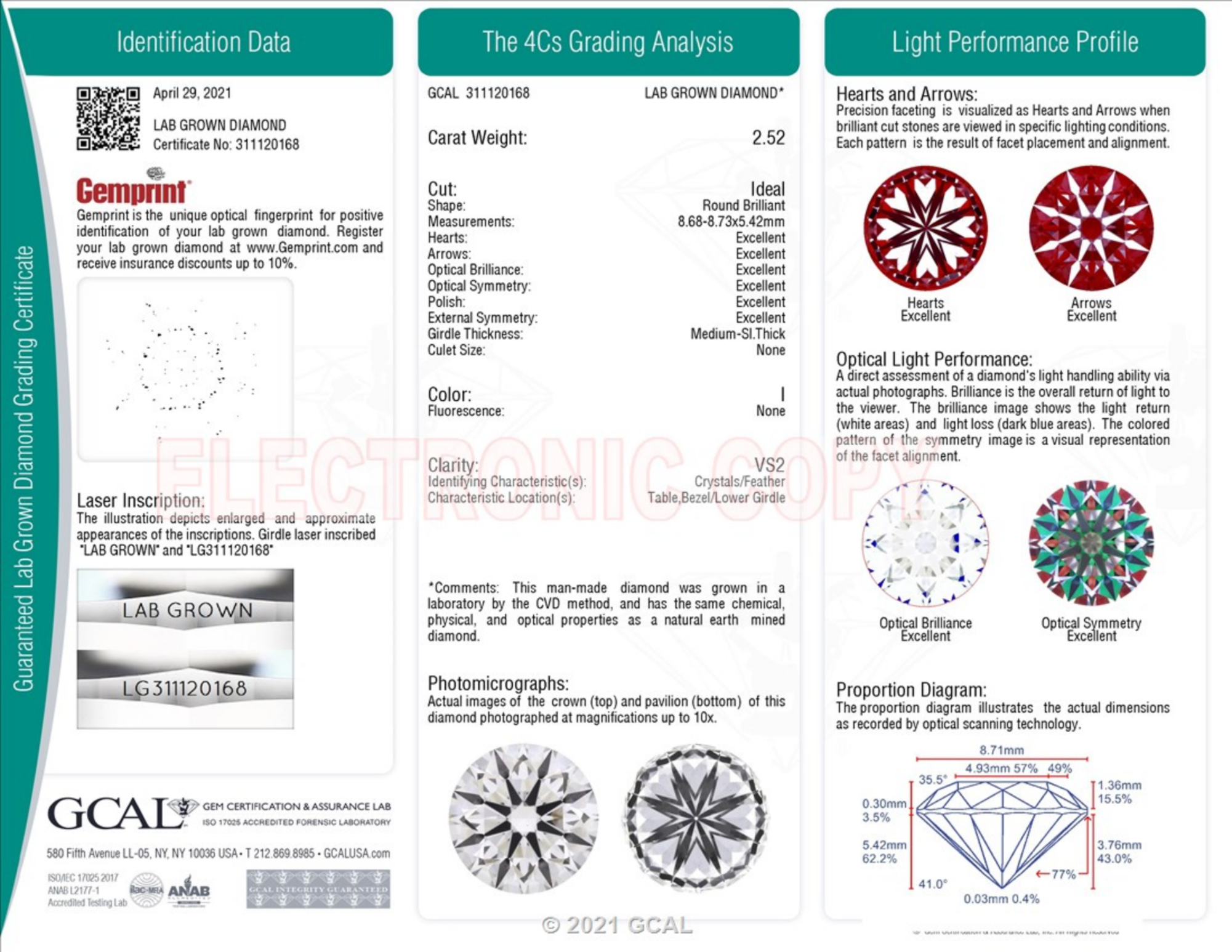 Your 2.52 carat Round lab diamond is graded VS2 clarity, which stands for Very Slightly Included 2. Read more about VS2 clarity diamonds here, or learn more about diamond clarity in general here.