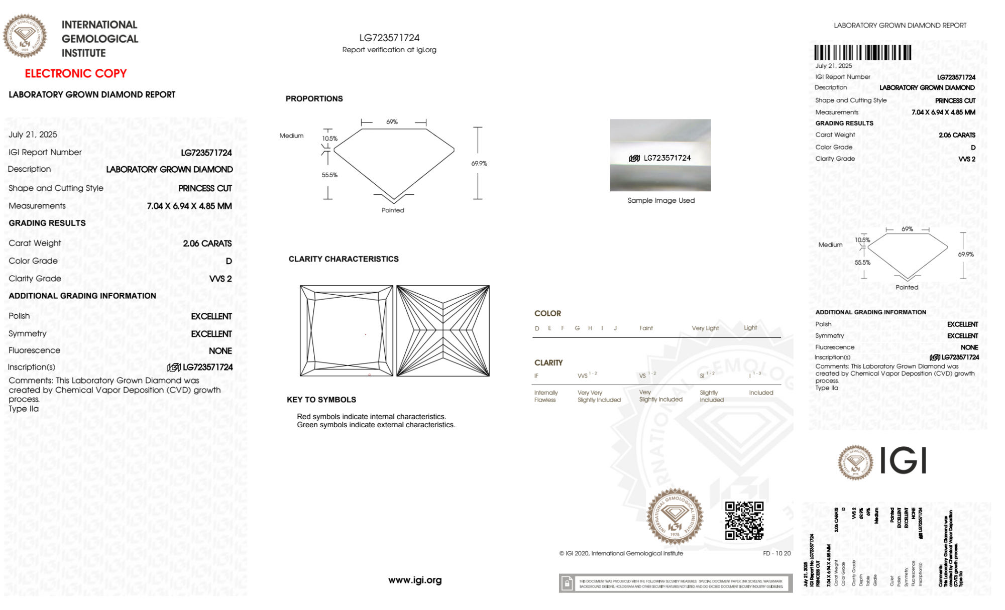Your 2.06 carat Princess lab diamond is graded D color (Colorless), and you can read more about D color diamonds here.