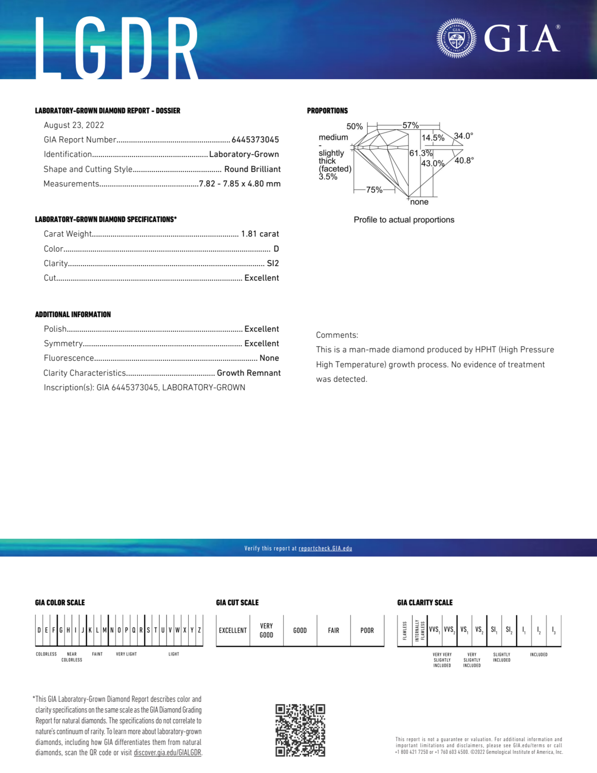 Your 1.81 carat Round lab diamond is graded D color (Colorless), and you can read more about D color diamonds here.
