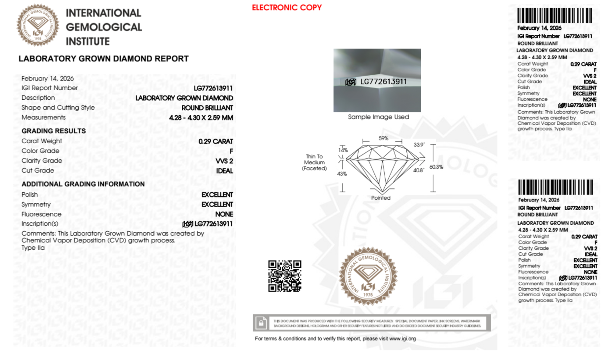 Your 0.29 carat Round lab diamond is graded F color (Colorless), and you can read more about F color diamonds here.